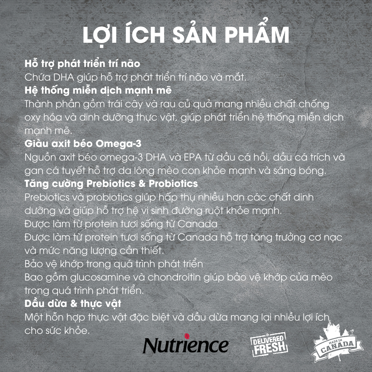 - Sản phẩm Nutrience Original Healthy Kitten được chế biến để đáp ứng các mức dinh dưỡng cho sự tăng trưởng được thiết lập trong hồ sơ dinh dưỡng thức ăn cho mèo của AAFCO. Hướng dẫn cách cho ăn