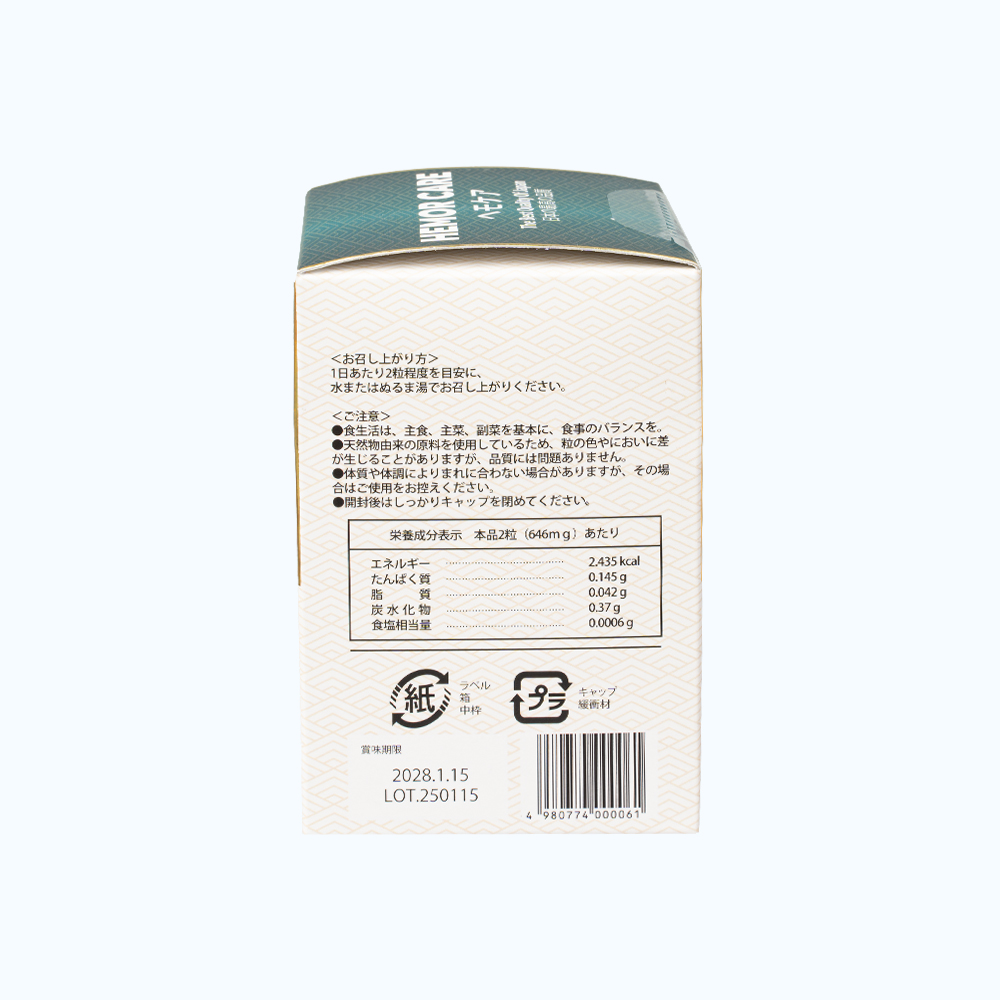 Bột chiết xuất quả cây cọ lùn (Serenoa repens, Serenoa serrulata) (tỷ lệ chiết xuất 10:1): 55mg; Chitosan: 50mg; Bột nấm Ngưu chương chi (Antrodia Cinnamomea): 10mg; Bột chiết xuất hạt bí ngô khô phương Tây (Cucurbita Pepo) (tỷ lệ chiết xuất 50:1): 5mg; Bột chiết xuất củ Nhân sâm Hàn Quốc (Kourai ninjin) (tỷ lệ chiết xuất 5:1): 5mg; Bột củ Maca (Lepidium meyenii): 5mg; Vitamin B1 (Thiamine Hydrochloride): 2mg; Vitamin B2 (Riboflavin): 2mg; Vitamin B6 (Pyridoxine Hydrochloride): 2mg; Bột chiết xuất pepride cá chứa Anserine (tỷ lệ chiết xuất 1:1): 1mg; Bột củ Tam thất (Panax Notoginseng): 1mg; Bột chiết xuất tảo Mozuku (chứa Fucoidan) (tỷ lệ chiết xuất 2:1): 1mg