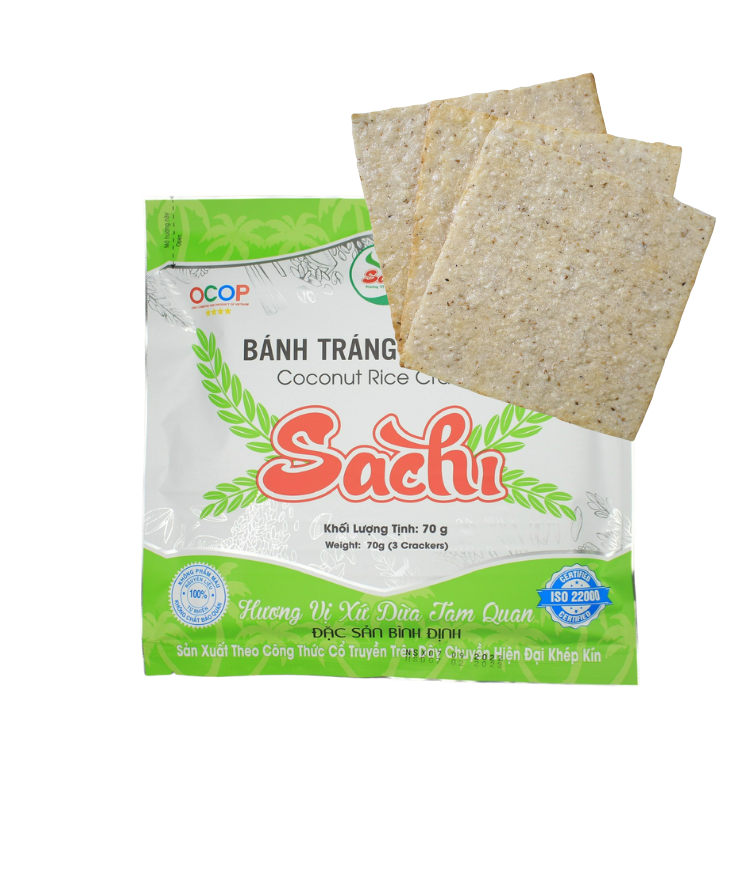 Bánh tráng nước dừa nướng sẵn Sachi xốp, giòn rụm, rong biển, được sản xuất trên dây chuyền hiện đại khép kín, bánh nướng bằng điện vàng đều 2 mặt, bao bì hút chân không