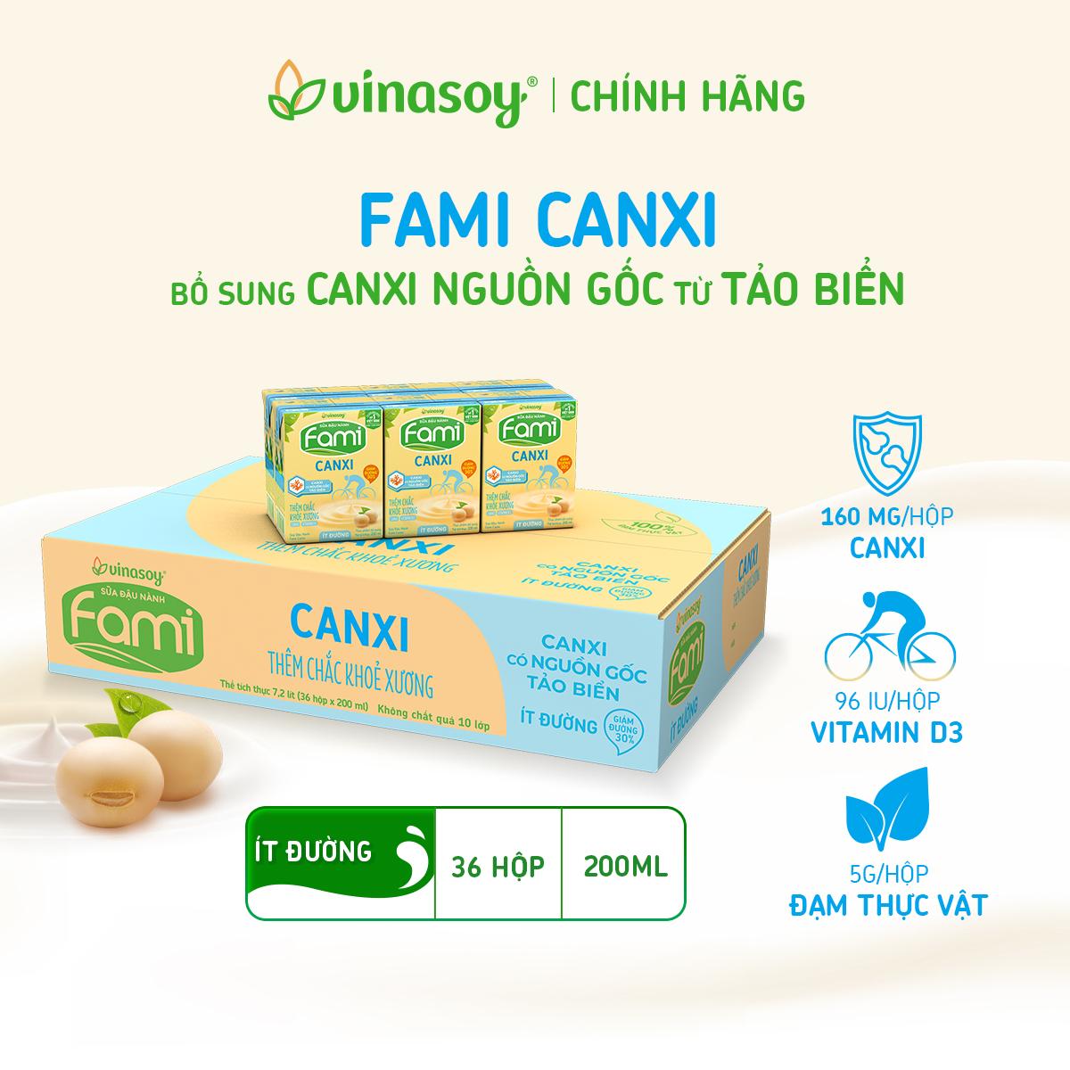 - Sữa đậu nành Fami Canxi Plus cùng công thức Bộ 3 Chắc Khỏe bổ sung Nano Canxi, Glucosamin và Protein thực vật hỗ trợ cho bạn có một hệ cơ - xương - khớp