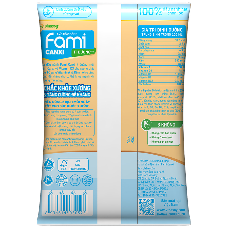 Dẻo dai, đẹp dáng, khỏe xương cùng Fami Sữa đậu nành ít đường Fami Canxi bịch 200ml là sản phẩm ít đường dạng bịch 200ml tiện dụng bổ sung thêm canxi nhưng vẫn được làm từ 100% hạt đậu nành, nhưng Fami Canxi được bổ sung thêm canxi và vitamin D3, tăng khả năng hấp thụ canxi, giúp cho hệ xương chắc khỏe. Fami mang đến tinh túy đậu nành cho mọi người Fami cam kết không ngừng sáng tạo và tối ưu hóa nguồn dinh dưỡng quý báu từ đậu nành thiên nhiên để mang đến cộng đồng cơ hội sử dụng phổ biến các sản phẩm chất lượng tốt nhất có nguồn gốc từ đậu nành. Nhờ đó, không chỉ chúng tôi mà đối tác và cộng đồng xung quanh sẽ có được một cuộc sống ý nghĩa hơn, tốt đẹp hơn và thịnh vượng hơn” Nỗ lực không mệt mỏi nhằm đem đến những sản phẩm dinh dưỡng tối ưu nhất từ nguồn đậu nành thiên nhiên đến cho người tiêu dùng. Luôn đi đầu trong nghiên cứu và ứng dụng khoa học tiên tiến trong công nghệ chế biến đậu nành nhằm cho ra đời những thương hiệu mạnh, uy tín.Tự hào là một thương hiệu Việt, được kế thừa những giá trị tốt đẹp “tương thân tương ái”, “uống nước nhớ nguồn” của người Việt Nam Hướng dẫn sử dụng