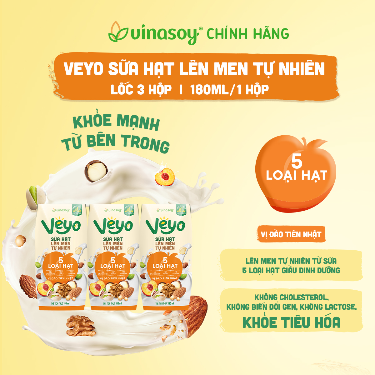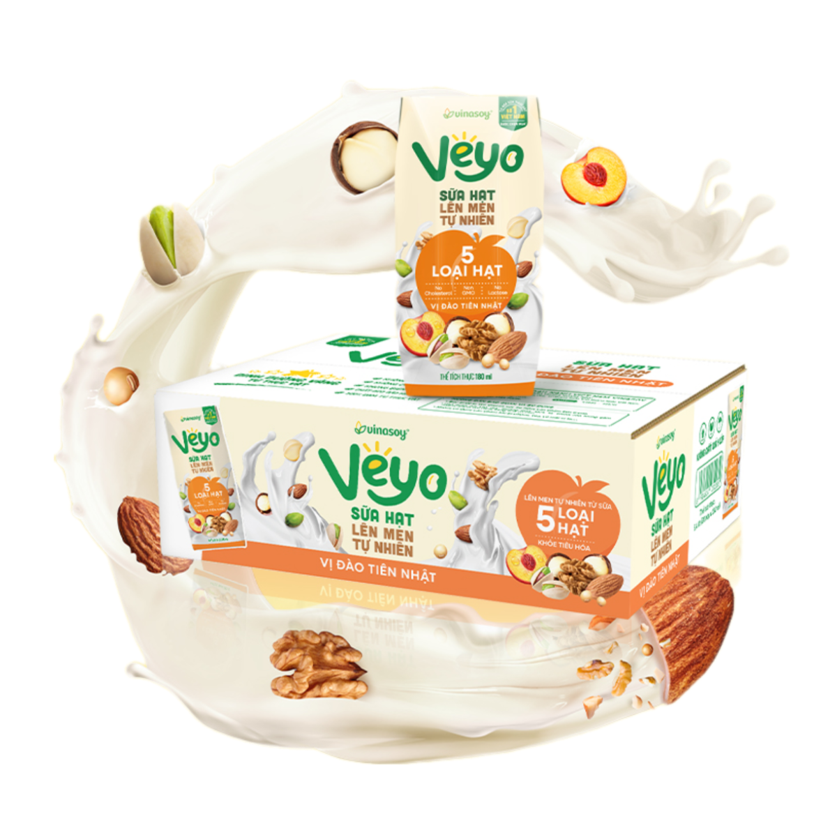 SỮA CHUA UỐNG 100% TỪ THỰC VẬT ĐẦU TIÊN TẠI VIỆT NAM Được lên men tự nhiên từ 100% sữa 5 loại hạt giàu dinh dưỡng: Mắc ca, Óc chó, Hạnh nhân, Dẻ dười, Đậu nành. VEYO Yogurt mang đến cho bạn trải nghiệm hương vị thơm ngon mới lạ: vị chua chua ngọt thanh, vị bùi béo từ hạt hòa quyền cùng với hương vị trái cây thanh mát Nhật Bản, mang đến cho bạn nguồn năng lượng xanh, tươi trẻ mỗi ngày. Nước, sữa chua lên men tự nhiên từ hạt thực vật (40%) (nước, đường, đậu nành, hạnh nhân, dẻ cười, mắc ca, óc chó, men thuần chay (Streptococcus thermophilus và Lactobacillus bulgaricus)), đường, xirô fructoza, bột kem thực vật, chất ổn định (466, 418, 500 (ii)), nước ép chanh, chiết xuất cà rốt cô đặc, hương Đào Tiên Nhật giống tự nhiên và hương liệu tự nhiên dùng cho thực phẩm, muối ăn, chiết xuất trái dành dành. Có chưa đậu nành & các loại hạt (free nuts)