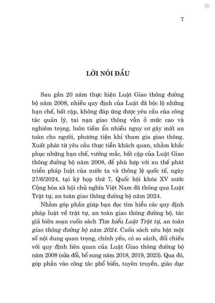 Qua việc phân tích ngắn gọn nội dung trong từng điều luật (có so sánh, đối chiếu với các quy định của Luật Giao thông đường bộ năm 2008 (sửa đổi, bổ sung năm 2018, 2019, 2023)), cuốn sách sẽ giúp bạn đọc dễ dàng tìm hiểu và nắm bắt được các quy định của Luật Trật tự, an toàn giao thông đường bộ năm 2024.
