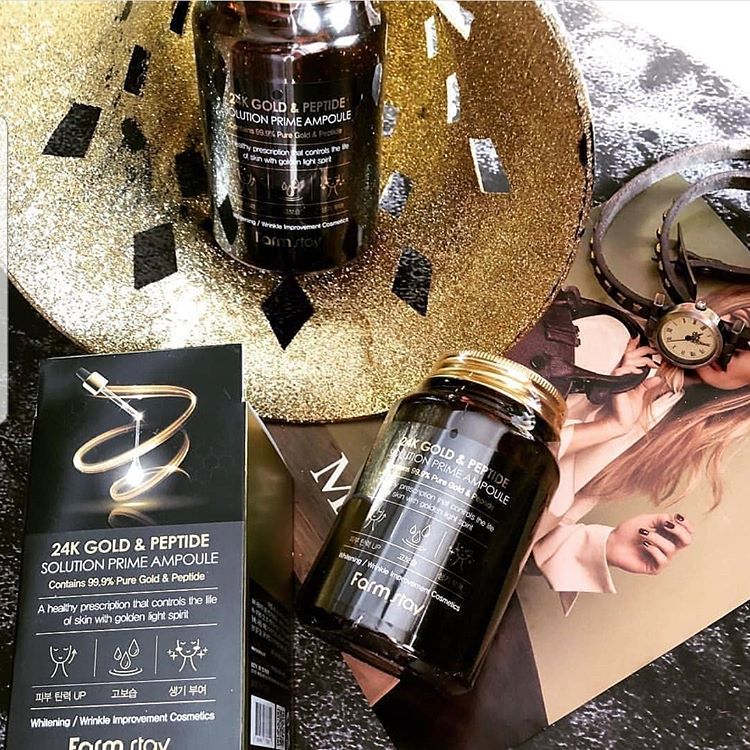 Huyết thanh Ampoule với Vàng và Peptide Dung tích:35ml Xuất xứ:Hàn Quốc Thương hiệu: Farmstay Dòng sản phẩm Chăm sóc da cao cấp - serum với các thành phần quý giá : Vàng 24 cara
