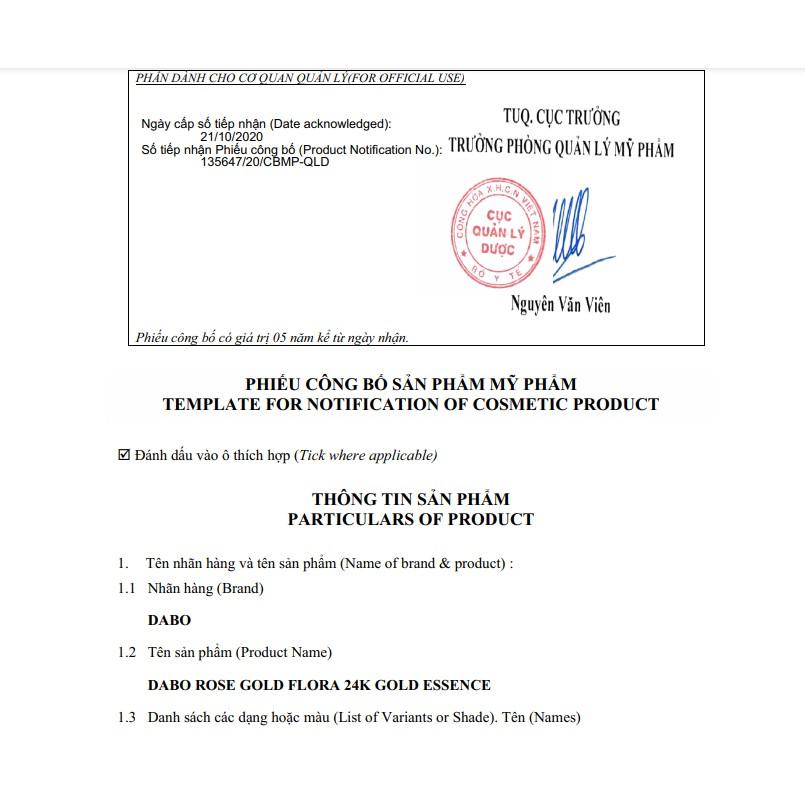 Công ty Cổ phần Quốc tế Thiên Anh là đơn vị chuyên phân phối độc quyền mỹ phẩm nhập khẩu chính hãng DABO Hàn Quốc. Trong đó Tinh chất Vàng cao cấp DABO GOLD ESSENCE được Thiên Anh độc quyền phân phối tại Việt Nam. Tinh chất đã được Cục quản lý dược Bộ Y tế cấp Giấy công bố sản phẩm với đầy đủ giấy tờ chứng minh nguồn gốc xuất xứ, hóa đơn GTGT, tem nhãn theo quy định của pháp luật.
