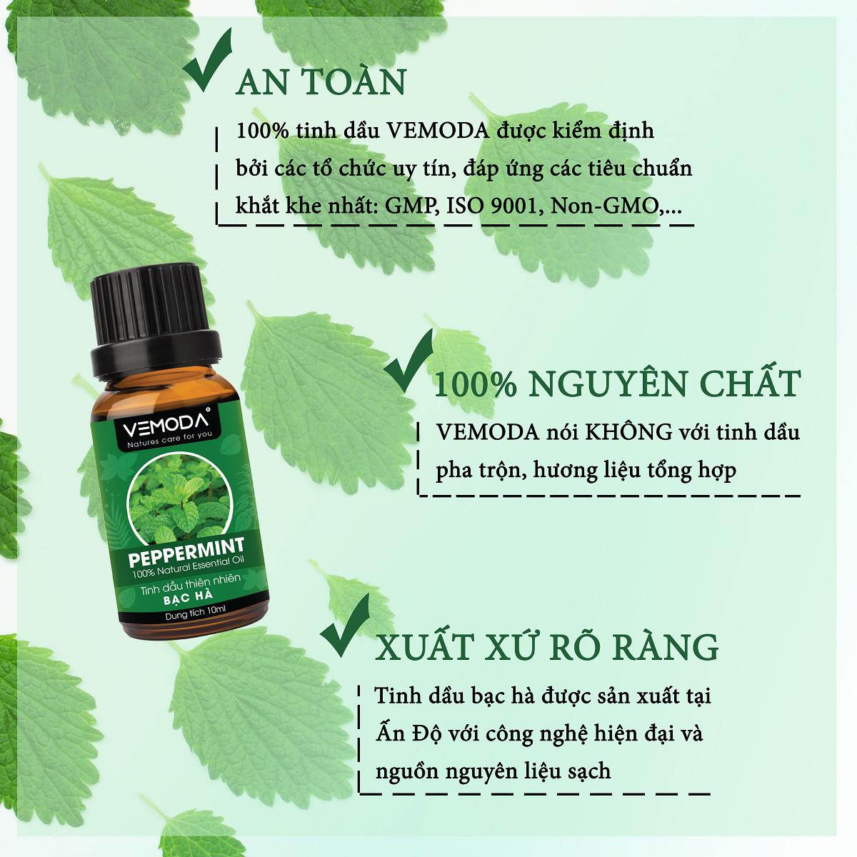 Mua tại TiktokTINH DẦU BẠC HÀ CAO CẤP VEMODA 10ML Tinh dầu Bạc hà cao cấp VEMODA giúp thư giãn, kháng khuẩn, giải cảm, xua đuổi côn trùng, chăm sóc răng miệng Tinh dầu Bạc hà cao cấp Vemoda được nhập khẩu trực tiếp từ Ấn Độ, một trong những quốc gia sản xuất tinh dầu hàng đầu thế giới. Các sản phẩm tinh dầu đều được tiến hành lấy mẫu và kiểm nghiệm tại Trung tâm kỹ thuật tiêu chuẩn đo lường chất lượng 3 (QUATEST 3)/ Tổng cục tiêu chuẩn đo lường chất lượng để đảm bảo chất lượng sản phẩm đúng tiêu chuẩn và tốt nhất cho khách hàng. Với Vemoda, an toàn sức khỏe người tiêu dùng luôn được đặt lên hàng đầu. NGUỒN GỐC VÀ CHẤT LƯỢNG TINH DẦU BẠC HÀ CAO CẤP VEMODA