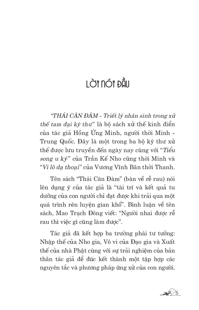 - Giới thiệu Thái Căn Đàm (bàn về rễ rau) bàn về gốc rễ đạo đức làm người với dụng ý rằng: tài trí và kết quả tu dưỡng của con người chỉ đạt được khi trải qua một quá trình trau dồi, rèn luyện gian khổ, bền bỉ. Tinh Hoa Xử Thế Phương Đông - Thái Căn Đàm Thái Căn Đàm (bàn về rễ rau) bàn về gốc rễ đạo đức làm người với dụng ý rằng: tài trí và kết quả tu dưỡng của con người chỉ đạt được khi trải qua một quá trình trau dồi, rèn luyện gian khổ, bền bỉ. Sách chứa đựng các nguyên tắc và phương pháp ứng xử linh động của con người biết sống và biết vận dụng một cách tự nhiên và chân phác những ý tưởng tinh túy nhất của ba khuynh hướng tư tưởng hòa đồng trong dòng chảy kỳ diệu, mang sắc thái văn hóa riêng biệt của đời sống xã hội phương Đông: Nhập thế của Nho giáo, Vô vi của Đạo giáo và Xuất thế của Phật giáo. Các tư tưởng triết lý và quan trọng nhưng được trình bày ngắn gọn bằng cách diễn giải những câu cách ngôn trí tuệ về nhân sinh và xử thế, hàm chứa ý nghĩa sâu sắc được minh họa qua những điển cố, sự tích chọn lọc thật ý vị và đầy sức thuyết phục, sẽ đọng lại trong tâm trí người đọc nhiều điều đáng suy ngẫm.