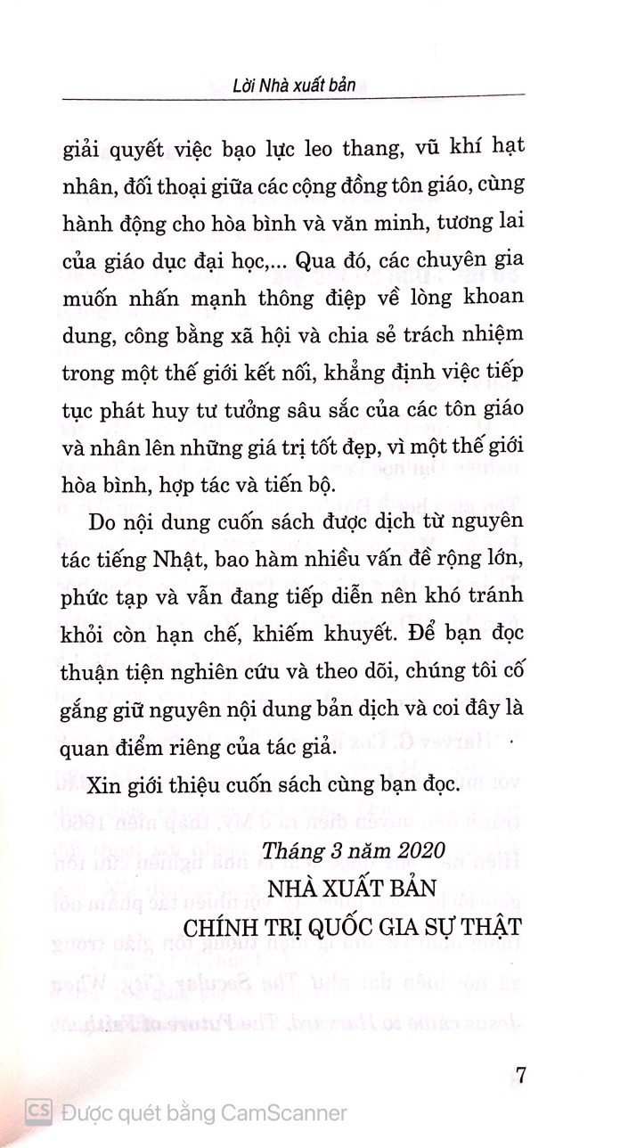 Nội dung cuốn sách được trình bày dưới hình thức một cuộc đối thoại cởi mở và đầy trách nhiệm giữa Tiến sĩ tôn giáo học Harvey G.Cox – chuyên gia nghiên cứu hàng đầu người Mỹ về vấn đề tôn giáo – văn ...