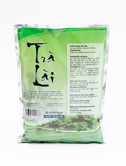 Mô tả: TRÀ LÀI GTP - CHUYÊN PHA TRÀ GIẢI KHÁT 100% lá trà tự nhiên, từ nguồn nguyên liệu trà Bảo Lộc, Lâm Đồng, Việt Nam. Hương hoa lài tự nhiên, được ủ với
