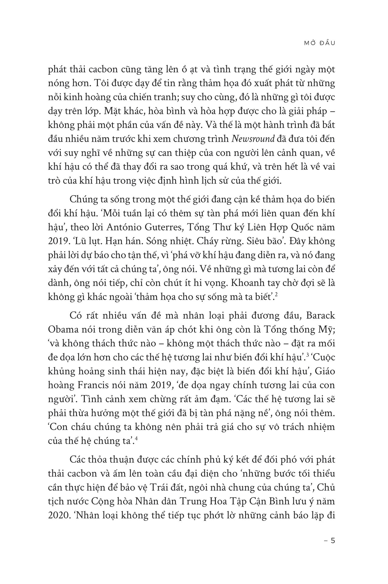 1. Cuốn sách này không nói về những gì sẽ diễn ra trong tương lai. Mục đích của nó không phải để thách thức những tiếng nói đồng thanh mang tính áp đảo của cộng đồng khoa học, cũng không tập trung vào các điều kiện toàn cầu hiện tại hay xem xét những bước đi nào có thể giảm thiểu một số hoặc thậm chí là nhiều vấn đề tồi tệ nhất do biến đổi khí hậu đặt ra, dẫu là qua sự thích nghi hay giới thiệu những công nghệ mới. Thay vào đó, mục đích của nó là xem xét quá khứ, hiểu và giải thích chúng ta đã ở vào vị thế mà nay có vẻ thật hiểm nghèo như thế nào.