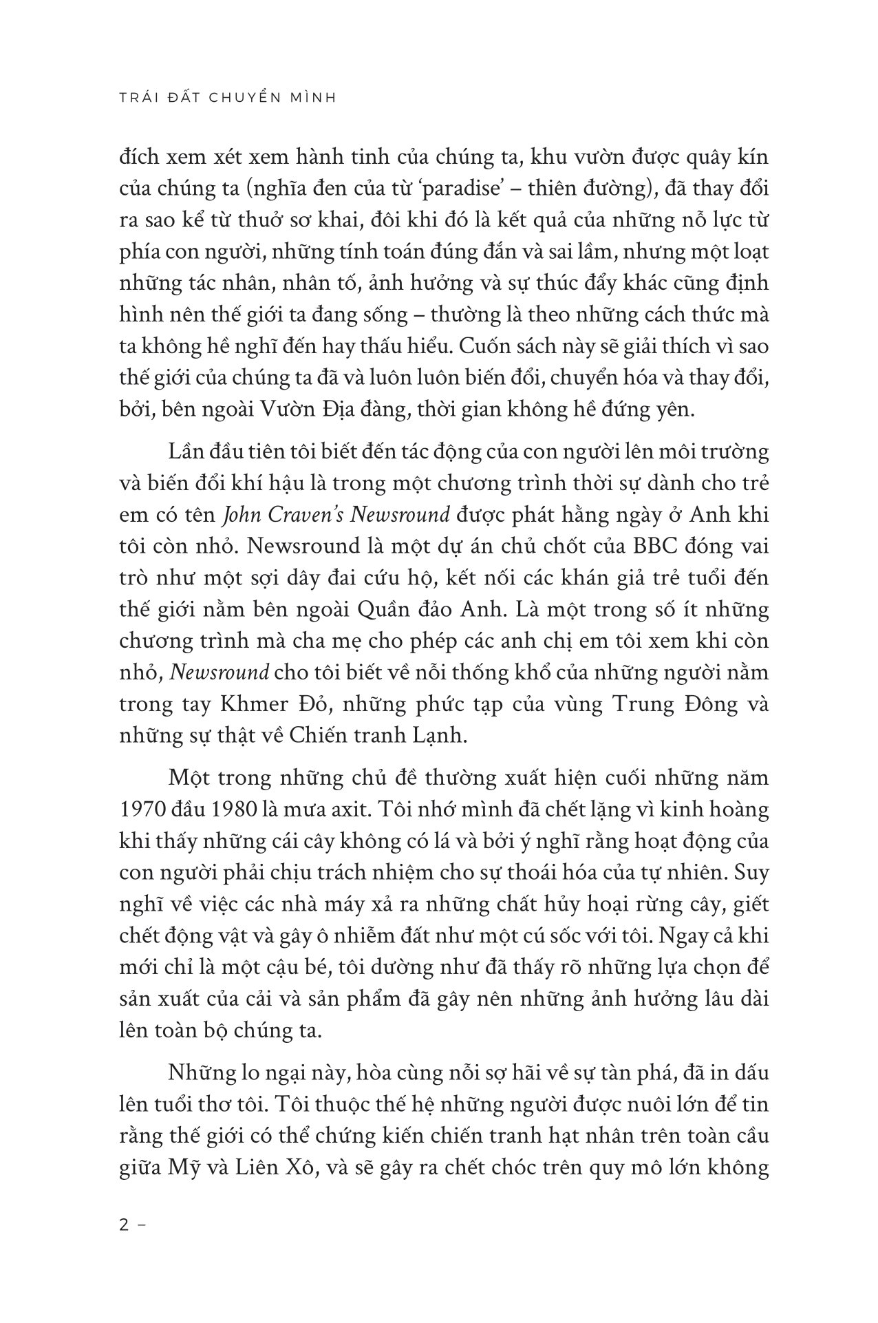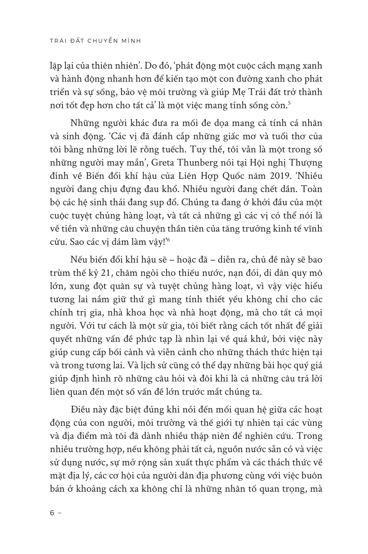 Ban đầu, tôi nghĩ mình sẽ chỉ viết về lịch sử, rằng khí hậu đã định hình thế giới quanh ta như thế nào, và về những chiều hướng mà những biến chuyển trong nhiệt độ toàn cầu, lượng mưa và mực nước biển – cùng những hiện tượng cực đoan, như siêu bão, núi lửa phun trào và va chạm thiên thạch – đã ảnh hưởng lên quá khứ, sắp đặt nên những khoảnh khắc, những thời kỳ và bối cảnh giải thích vai trò quan trọng đến nhường nào của khí hậu trong lịch sử thế giới.