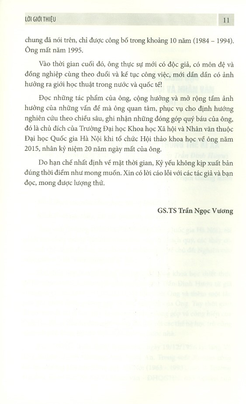 Từ thập niên thứ 5 của thế kỷ XX, khi chính phủ Quốc dân Đảng của Tưởng Giới Thạch buộc phải rút chạy ra quần đảo Đài Loan, nhà nước Cộng hoà Nhân dân Trung Hoa làm chủ Đại Lục, thì trên toàn bộ khu vực Đông Á, không còn một chính phủ hay nhà nước nào chính thức lên tiếng chủ thể kế thừa chính thức của Nho giáo. Tuy vẫn tồn tại những định chế nghiên cứu về chính trị, văn hoá và học thuật ở các quốc gia và vùng lãnh thổ coi Nho giáo là đối tượng chủ yếu, hay những nhóm học giả nhiệt thành cổ vũ Nho giáo, nhưng ở cấp độ bảo trợ nhà nước chính thức, và với tư cách một hệ ý thức thì hầu như Nho giáo đã hoàn toàn mất vị thế. | Sau vài mươi năm kể từ kết thúc Chiến tranh Thế giới thứ hai, trước hết là nền kinh tế, rồi tiếp theo đó là sự vươn lên mạnh mẽ và ngoạn mục về khoa học, công nghệ và văn hoá của Nhật Bản đã gây nên sự ngạc nhiên, sửng sốt và khâm phục của giới quan sát chính trị trên thế giới. Nhật Bản làm nên một sự thần kỳ! Sự vươn lên mạnh mẽ trong mấy thập kỷ tiếp theo của Đài Loan, Hàn Quốc, Hồng Kông và Singapore làm hình thành chuỗi các quốc gia và vùng lãnh thổ được định danh bằng các tên gọi đầy phấn khích là các nước công nghiệp mới (New Industrial Countries-NIC), “những chú rồng nhỏ” hay “những con hổ mới”! Nếu như ở các quốc gia và vùng lãnh thổ vừa nói, mối quan tâm xã hội và những vấn đề khoa học về các truyền thống văn hoá và học thuật thuộc về Trung Quốc, trước cách mạng nói chung vẫn được tiếp tục duy trì một cách bền bỉ, liên tục thì ở các quốc gia “dân chủ mới” hay nói thẳng thắn hơn, các quốc gia theo hệ tư tưởng xã hội chủ nghĩa là Cộng hoà Nhân dân Trung Hoa, Cộng hoà Dân chủ Nhân dân Triều Tiên và Việt Nam Dân chủ Cộng hoà đều coi các học thuyết và tư tưởng, vănhoá truyền thống ấy là những “tàn dư độc hại của phong kiến thực dân” nên chủ yếu phải “đào sâu chôn chặt”! Trong khung khổ ấy, những công trình nghiên cứu về Nho giáo ở các quốc gia vừa để cập có giá trị sâu sắc và cơ bản xuất hiện ít dần theo hướng “dao động tắt dần”. Nhưng “những cú huých” từ chính nền học thuật của các quốc gia và vùng lãnh thổ công nghiệp mới, tiếp theo đó là sự quan tâm mạnh mẽ về các quốc gia đó của nền học thuật u – Mỹ từ giữa những năm 80 đã bùng phát trở lại. Ngay chính học giả của Trung Hoa đại lục cũng lần lượt bừng tỉnh, thế hệ học giả trẻ tuổi xuất hiện và ngày càng được khẳng định. Đáng chú ý là những luận điểm nghiên cứu của các tác giả u - Mỹ, nổi bật và tiêu biểu nhất là công trình “Thế giới Hán hoá mới” (Le monde nouveau sinise) của L. Vandermeersch, ở đó nhà nghiên cứu khẳng định, khác với các tín truyền thống của các quốc gia trong Hán tự văn hoá quyển, rằng Nho giáo là nguyên nhân chủ yếu làm cho các nước trong khu vực trở nên “nước yếu dân hèn” trên thực tế, nếu biết khai thác hợp lý và đồng bộ, những thành tố quý báu nhất của Nho giáo sẽ được vận dụng trở nên là động lực mới của sự cất cánh ở các quốc gia mang trong mình những truyền thống đó! Sự phục hưng của một phong trào Tân Nho giáo như vậy dần dần được sự cộng hưởng mạnh mẽ, đến mức mà vào năm 1996, Đại hội của phong trào Tân Nho giáo quốc tế lần thứ VI đã được tổ chức trọng thể tại Thượng Hải, với sự có mặt và diễn văn chào mừng của Tổng Bí thư Đảng Cộng sản Trung Quốc Giang Trạch Dân. Từ đầu những năm 90 thế kỷ trước, nghiên cứu Nho giáo không còn bị kỳ thị hay tìm cách hạn chế nữa. | Trần Đình Hượu bắt đầu nghiên cứu Trung Quốc nói chung, Nho giáo nói riêng từ cuối những năm 50 của thế kỷ trước. Được cử đi đào tạo ở Liên Xô rồi về nước từ năm 1964, ông liên tục giảng dạy và nghiên cứu ở Khoa Ngữ văn Trường Đại học Tổng hợp Hà Nội, cho đến năm 1993. Những công trình nghiên cứu chính của ông về Nho giáo, vì bối cảnh chung đã nói trên, chỉ được công bố trong khoảng 10 năm (1984 - 1994). Ông mất năm 1995. Vào thời gian cuối đó, ông thực sự mới có độc giả, có môn đệ và đồng nghiệp cùng theo đuổi và kế tục công việc, mới dần dần có ảnh hưởng ra giới học thuật trong nước và quốc tế! Đọc những tác phẩm của ông, cộng hưởng và mở rộng tầm ảnh hưởng của những vấn đề mà ông quan tâm, phục vụ cho định hướng nghiên cứu theo chiều sâu, ghi nhận những đóng góp quý báu của ông, đó là chủ đích của Trường Đại học Khoa học Xã hội và Nhân văn thuộc Đại học Quốc gia Hà Nội khi tổ chức Hội thảo khoa học về ông năm 2015, nhân kỷ niệm 20 năm ngày mất của ông. Do hạn chế nhất định về mặt thời gian, Kỷ yếu không kịp xuất bản đúng thời điểm như mong muốn. Xin có lời cáo lỗi với các tác giả và bạn đọc, mong được lượng thứ GS.T