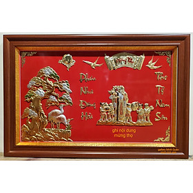 CHẤT LIỆU TRANH MỪNG THỌ. TRANH ĐƯỢC GÒ NỔI TỪ ĐỒNG VÀNG NGUYÊN CHẤT 100%. NỀN TRANH BẰNG GỖ MDF SƠN MÀU ĐỎ KHUNG TRANH HOA VĂN VÀNG COMPOSITE CAO CẤP MẶT TRANH LẮP KÍNH HOẶC MICA