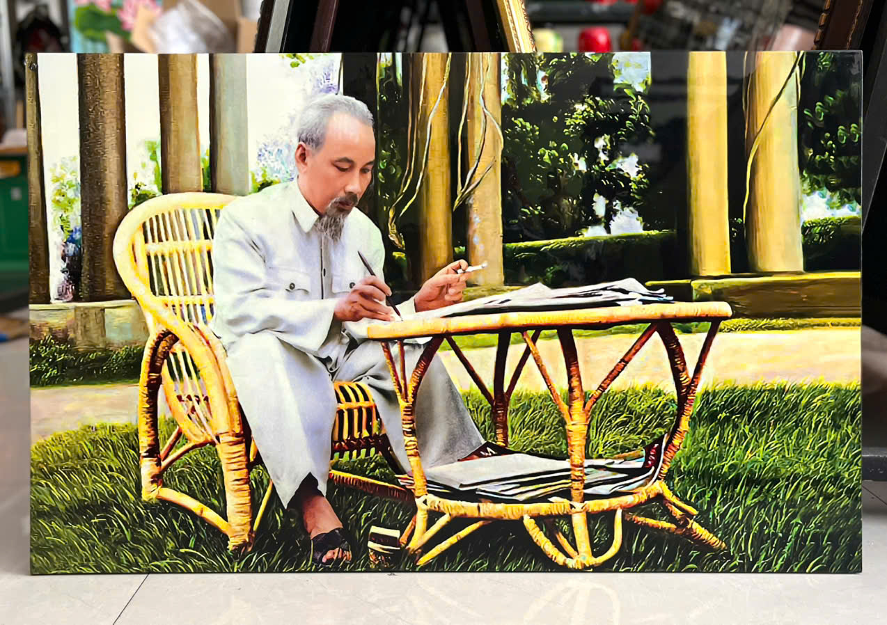 Tranh sơn mài -Bác Hồ quàng khăn đỏ cho học sinh Chất liệu: vẽ sơn mài. Khung composite cao cấp Kích thước 70*100cm
