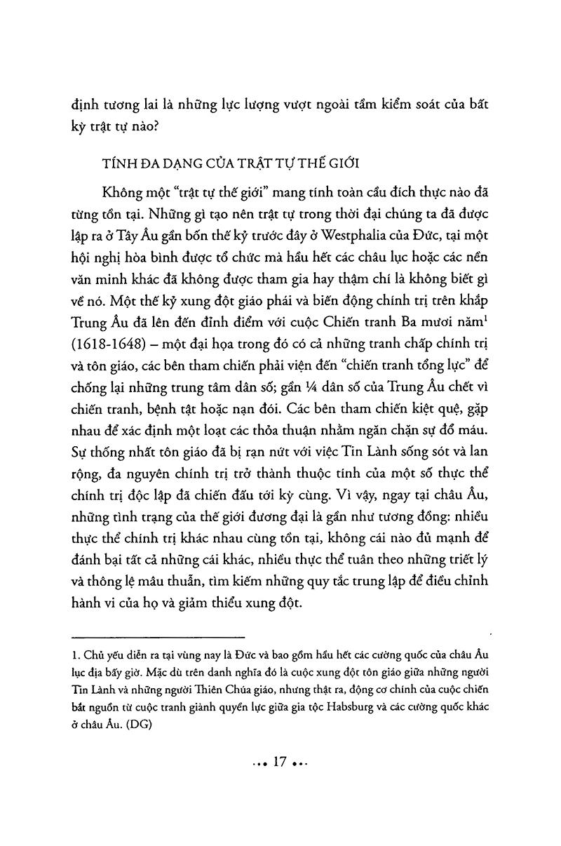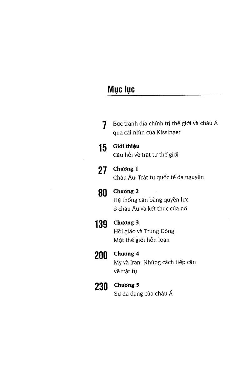 Mua tại TiktokTrật Tự Thế Giới (Tái Bản 2023) Trong tác phẩm, Kissinger xuất phát từ Hòa ước Westphalia để phân tích về tương quan giữa các nước, chủ yếu là các cường quốc và các khu vực giữ một vai trò đặc biệt đối với bức tranh địa chính trị thế giới, với những khác biệt trong thế giới quan và vị trí địa lý đã ảnh hưởng đến chính sách ngoại giao của mỗi nước như thế nào. Tác giả dành chương cuối (chương 9) để bàn về vấn đề toàn cầu hoá trong thời đại khoa học công nghệ, đặc biệt là tin học và truyền thông đại chúng lan tràn đã tác động mạnh mẽ đến dư luận, các nhà lãnh đạo và các quyết định chính trị hiện nay. Theo cách nhìn của Kissinger thì trật tự thế giới ngày nay cần được đặt trên hai yếu tố căn bản: