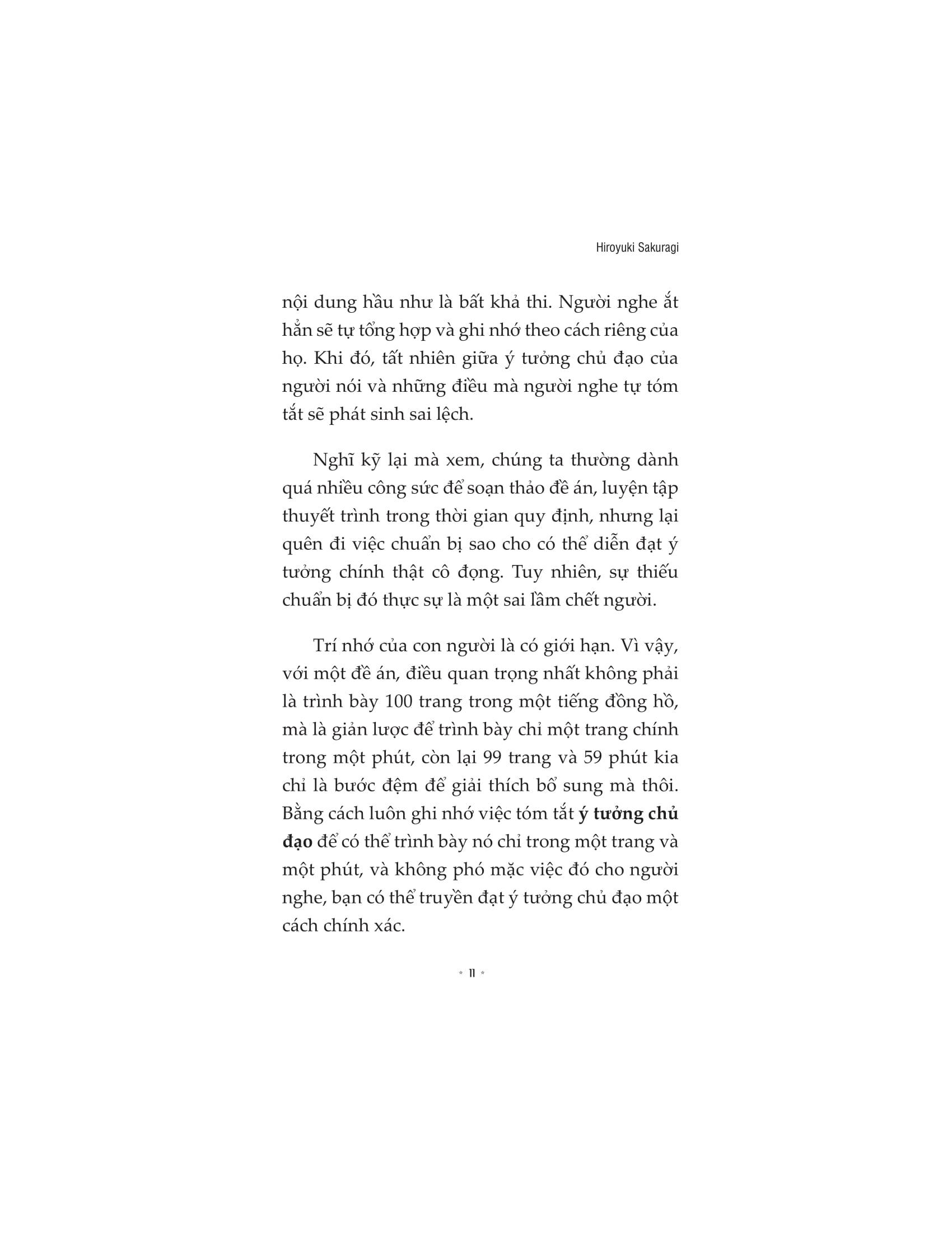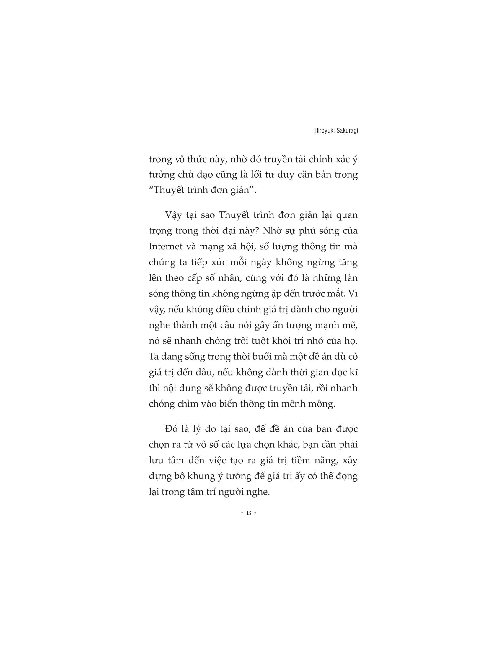 Chìa khóa cho vấn đề nằm ở việc nắm vững tư duy cũng như kỹ thuật để xây dựng ý tưởng chủ đạo, tạo ra các giá trị tiềm năng cho người nghe, đồng thời truyền tải chúng một cách ngắn gọn nhưng hiệu quả. Khi trình bày thuyết phục rành mạch, với kế hoạch rõ ràng xác đáng cùng kết quả thực tế khả thi, chắc chắn đề xuất của bạn sẽ dẽ dàng “chạm đích”. Cuốn sách với sáu chương ngắn gọn tập trung vào một kỹ thuật được gọi là «Thuyết trình đơn giản », một kỹ thuật cân bằng giữa việc tạo ra giá trị hấp dẫn và việc trình bày nó một cách rõ ràng dễ hiểu.