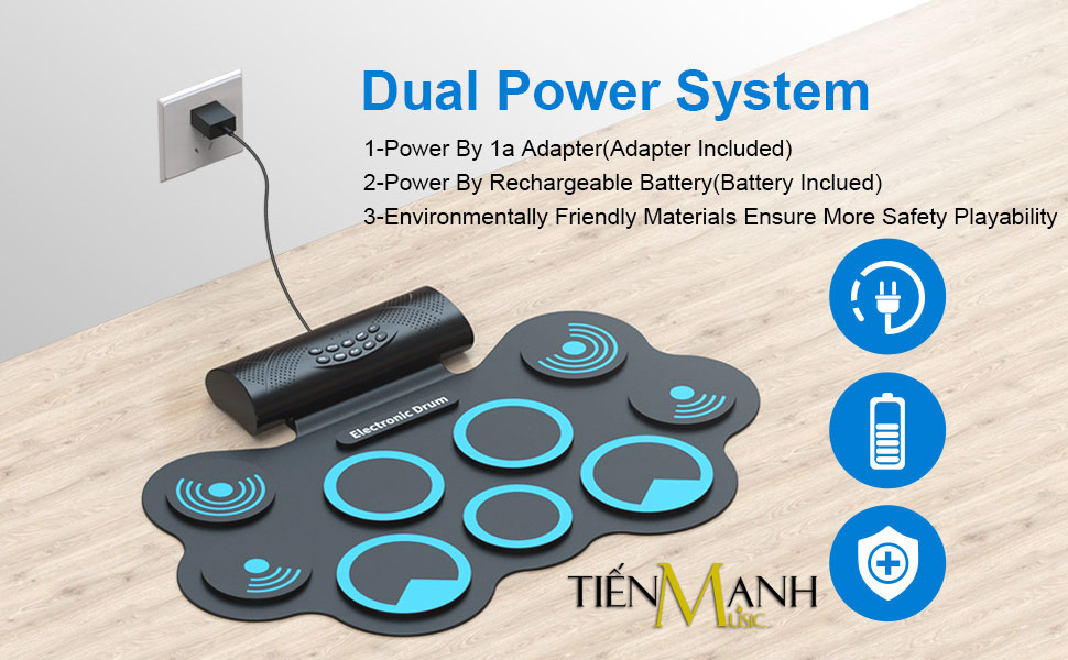 - Pin sạc, hỗ trợ Bluetooth để chơi trên app (đi kèm trống, có hướng dẫn tiếng việt), và phát nhạc lên trống.