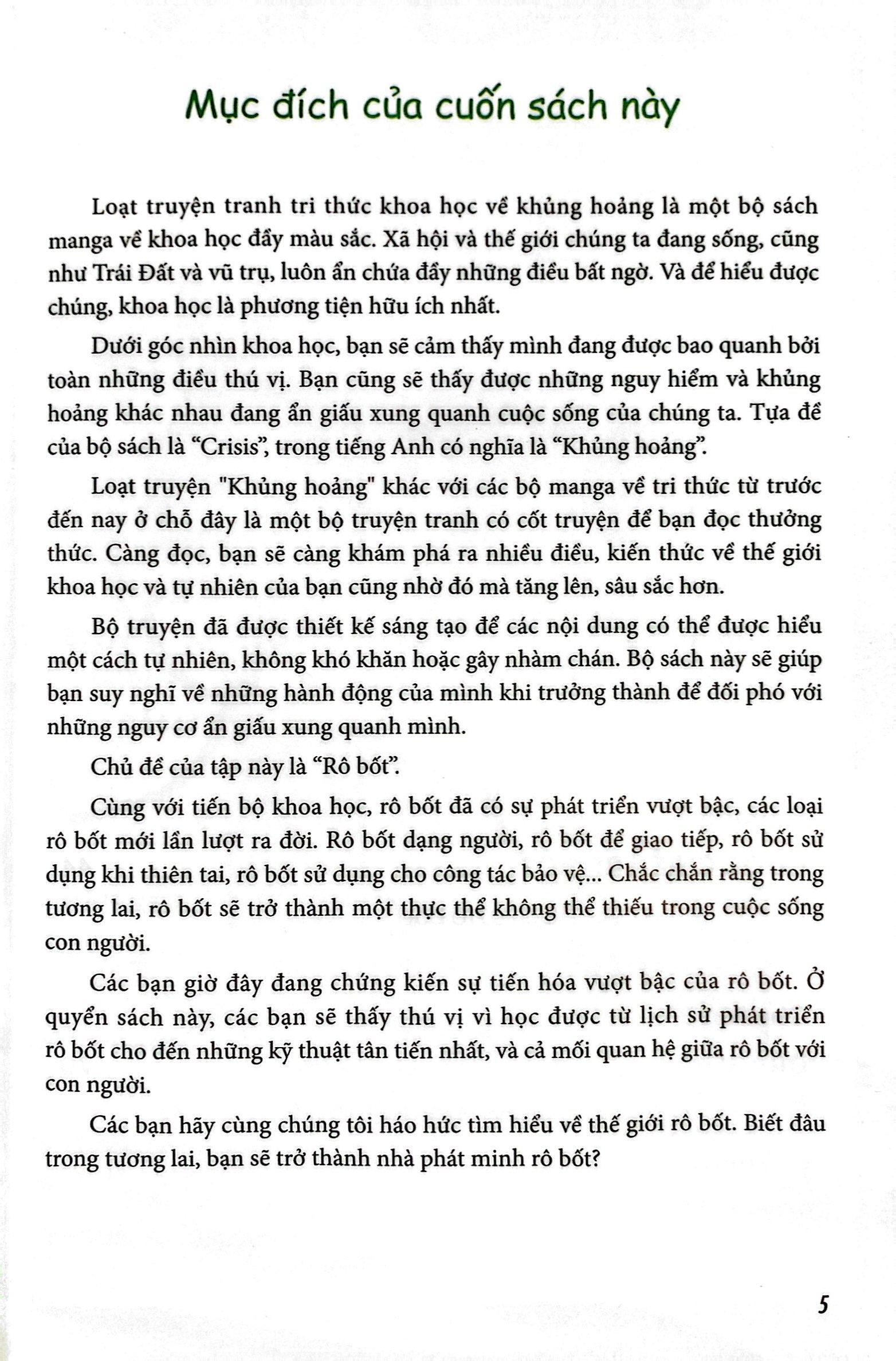 Khủng hoảng rô bốt là một trong bộ 8 sách Truyện tranh tri thức khoa học, cuốn sách với những nét vẽ minh họa sinh động sẽ đưa chúng ta tìm hiểu cụ thể về lĩnh vực phát triển rô bốt.