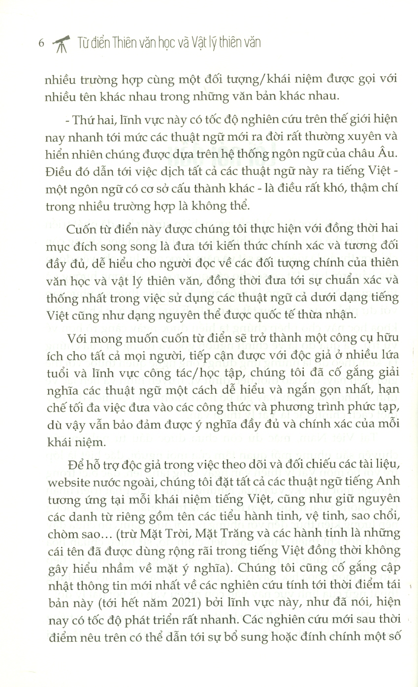 Cuốn từ điển này được thực hiện với hai mục đích song song là đưa tới kiến thức chính xác và tương đối đầy đủ, dễ hiểu cho người đọc về các đối tượng chính của thiên văn học và vật lý thiên văn, đồng thời đưa tới sự chuẩn xác và thống nhất trong việc sử dụng các thuật ngữ cả dưới dạng tiếng Việt cũng như dạng nguyên thể được quốc tế thừa nhận.