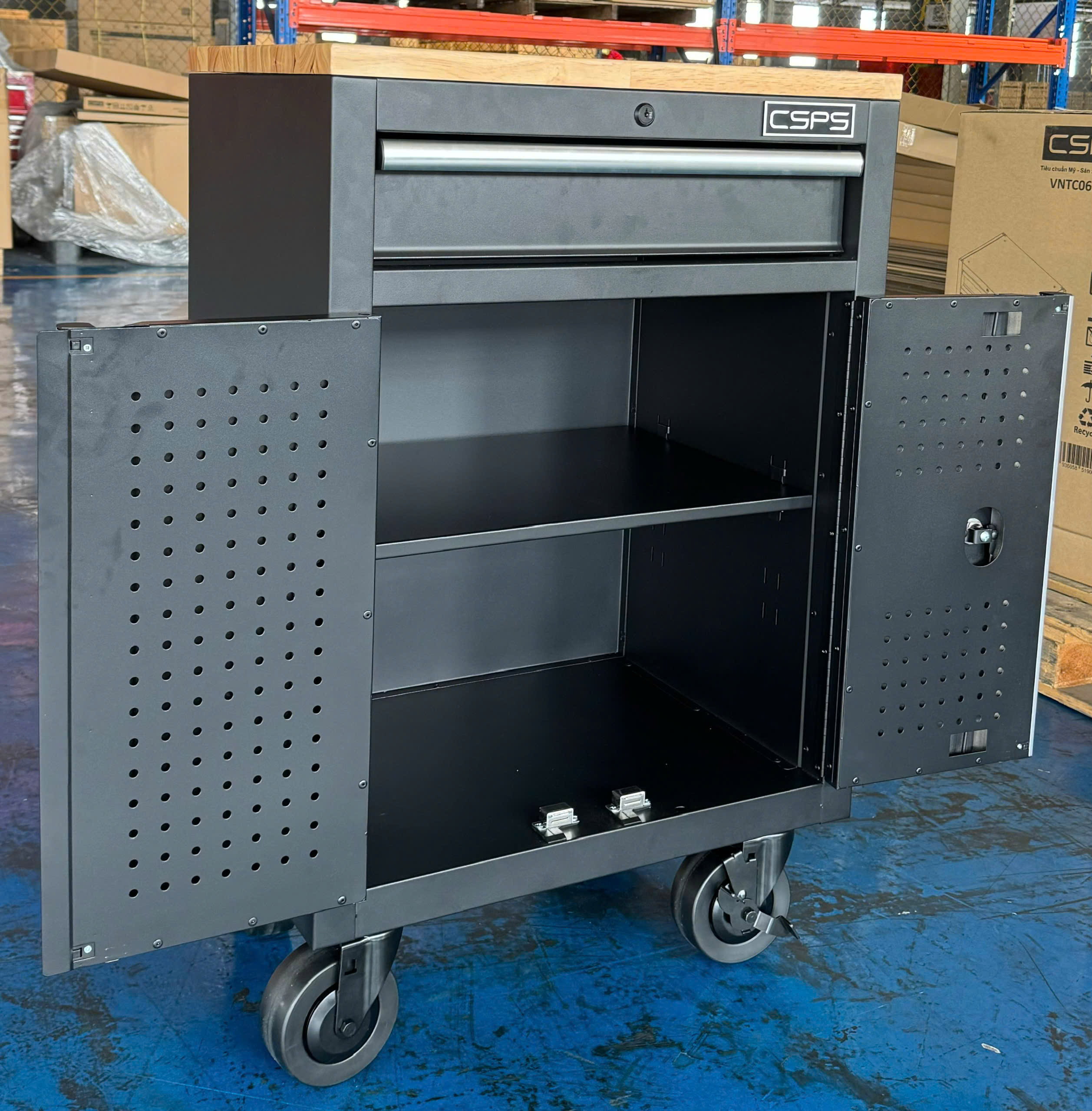 ✨Tủ dụng cụ CSPS 61cm - 01 hộc kéo màu đen bánh xe ván gỗ (tay cầm trắng)