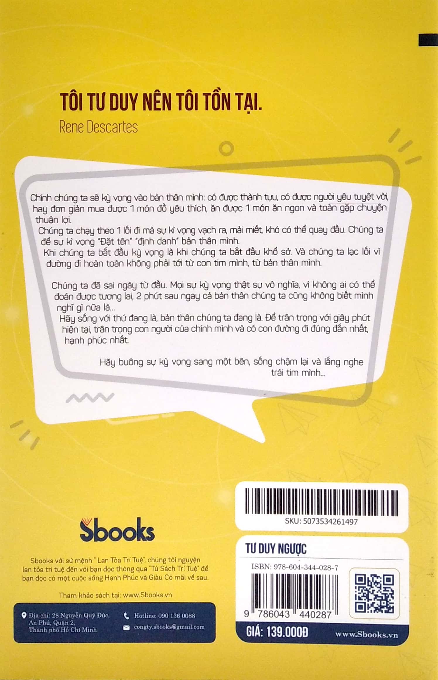 Mua tại TiktokTư Duy Ngược GIỚI THIỆU SÁCH: Chúng ta thực sự có hạnh phúc không? Chúng ta có đang sống cuộc đời mình không? Chúng ta có dám dũng cảm chiến thắng mọi khuôn mẫu, định kiến, đi ngược đám đông để khẳng định bản sắc riêng của mình không? Có bao giờ bạn tự hỏi như thế, rồi có câu trả lời cho chính mình? Tôi biết biết, không phải ai cũng đang sống cuộc đời của mình, không phải ai cũng dám vượt qua mọi lối mòn để sáng tạo và thành công… Dựa trên việc nghiên cứu, tìm hiểu, chắt lọc, tìm kiếm, ghi chép từ các câu chuyện trong đời sống, cũng như trải nghiệm của bản thân, tôi viết cuốn sách này. Cuốn sách sẽ giải mã bạn là ai, bạn cần Tư Duy Ngược để thành công và hạnh phúc như thế nào và các phương pháp giúp bạn dũng cảm sống cuộc đời mà bạn muốn.