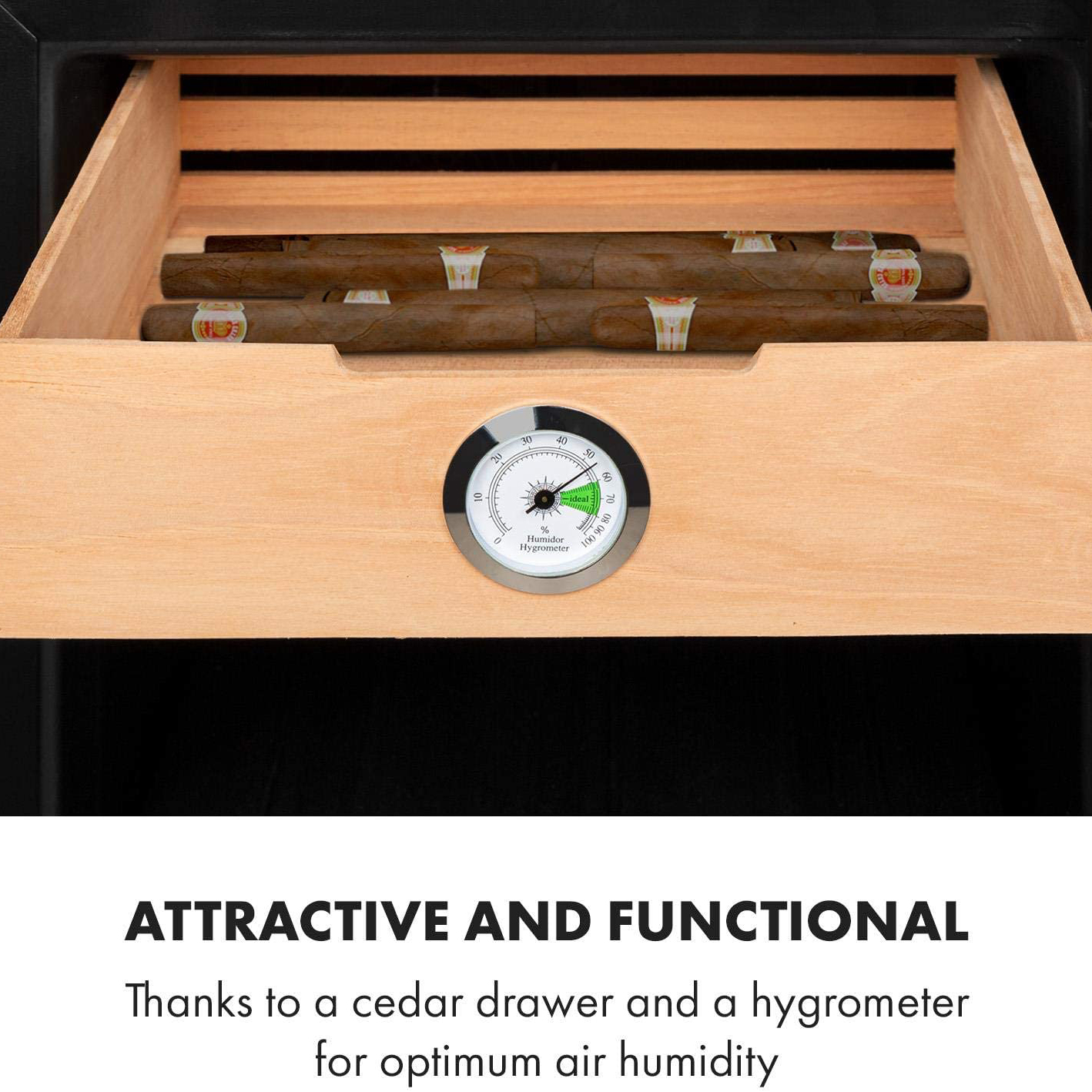 Trong nội thất 89 lít, CIGAR có thể được lưu trữ trong bốn ngăn kéo rộng rãi làm bằng gỗ tuyết tùng. Ba kệ lưu trữ ở khu vực phía trên cho phép lưu trữ tối đa 12 chai rượu. Đường ray chạy trơn tru cho phép truy cập nhanh chóng và dễ dàng. Máy đo độ ẩm tích hợp giúp dễ dàng duy trì độ ẩm lý tưởng – để CIGAR không bị khô và giữ nguyên hương vị.