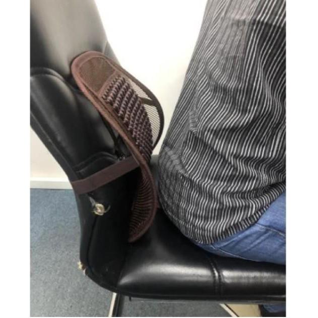 - Trên tấm tựa lưng lưới có hạt gỗ thoáng khí, giúp massage nhẹ nhàng cho lưng khi đi đường dài, ngồi lâu