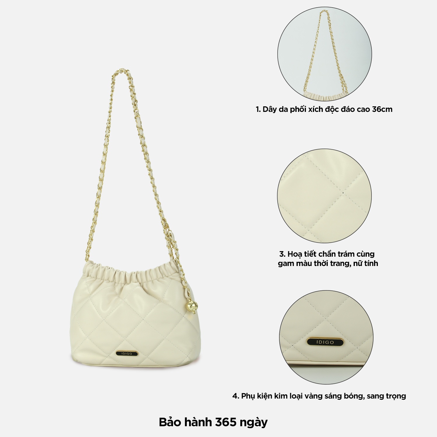 - Cách đeo: (1) đeo chéo (2) đeo vai Gam màu nữ tính, bền màu với thời gian, đường may chắc chắn. Chất liệu da tổng hợp có độ mềm vừa đủ tạo nên phom dáng túi, vừa có độ đàn hồi, vừa chống thấm nước nhẹ, bền đẹp và dễ dàng vệ sinh. Phom túi chữ nhật với chất liệu da có độ mềm vừa phải giúp túi hạn chế bị cong vênh, nhăn gãy khi sử dụng. Bên trong túi có 1 ngăn chính thích hợp đựng điện thoại 7inch trở, ví tiền, sổ tay nhỏ, sạc dự phòng, tai nghe, mỹ phẩm… Ngoài ra bên trong túi còn có 1 ngăn kéo nhỏ đựng chìa khoá, thẻ xe rất thích hợp sử dụng để đi làm, đi tiệc, đi chơi hay dạo phố. Túi có nút hít chắc chắn, dễ sử dụng cùng khóa kéo cao cấp hoạt động mượt mà và trơn tru. Đặc biệt, luân phiên đeo chéo/đeo vai với dây da phối xích cao 36cm giúp thay đổi phong cách. Sản phẩm túi xách này được IDIGO đặt sản xuất tại nhà máy Trung Quốc và nhập khẩu chính ngạch về Việt Nam, có thông tin sản phẩm nhập khẩu in rõ ràng trên tem nhãn. BẢO HÀNH SẢN PHẨM: