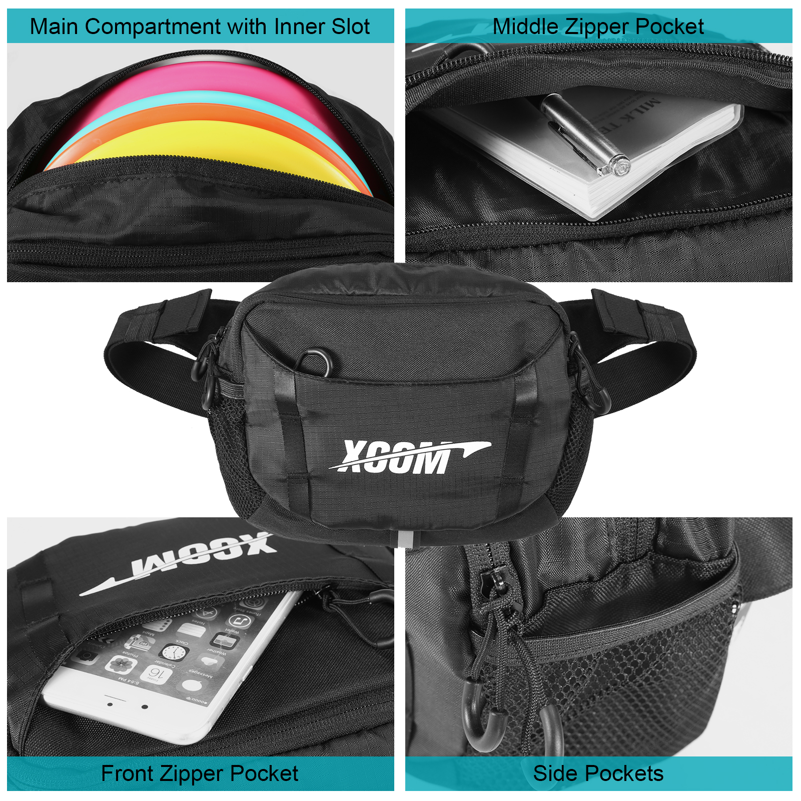 Disc Golf Waist Bag has multiple zippered pockets,which is easy to store and carry 5 discs(not included). Features: Made of lightweight polyester material,durable to use. Features a front zipperd pocket,a middle pocket,a mian compartment with