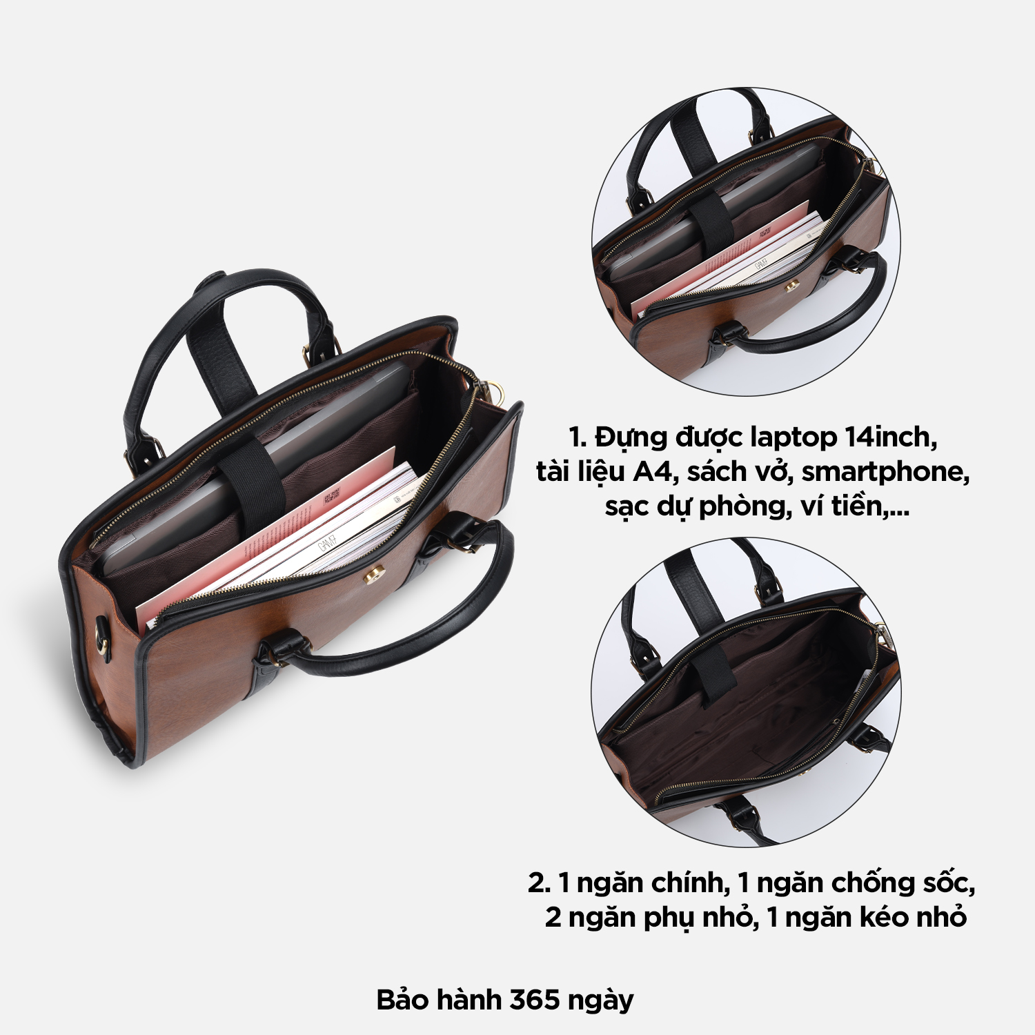 Cặp da công sở TCA25 có ngăn chính lớn, đựng vừa tài liệu khổ A4, máy tính xách tay 13 inch. Bên cạnh đó, cặp có nhiều ngăn phụ để bạn sắp xếp đồ đạc