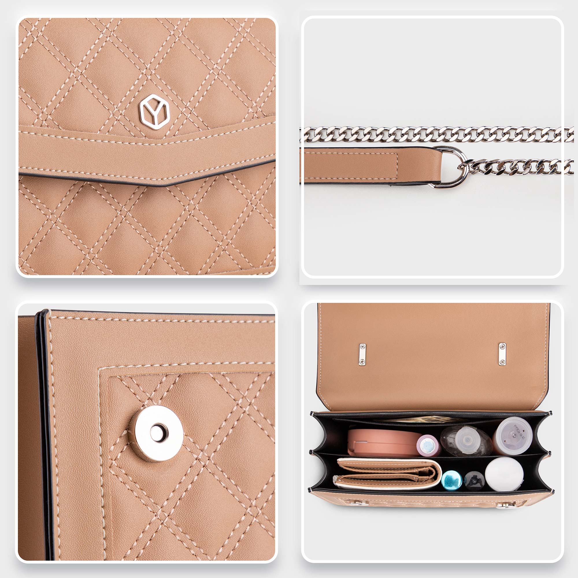 Mẫu túi đeo chéo Yuumy Seasand YN280 thời thượng với thiết kế chần bông quả trám sang chảnh và dây đeo kim loại ánh bạc tinh tế. Chất da mềm mại, form túi vừa vặn,