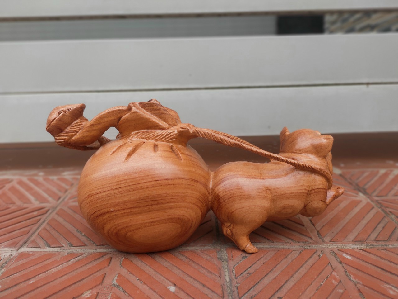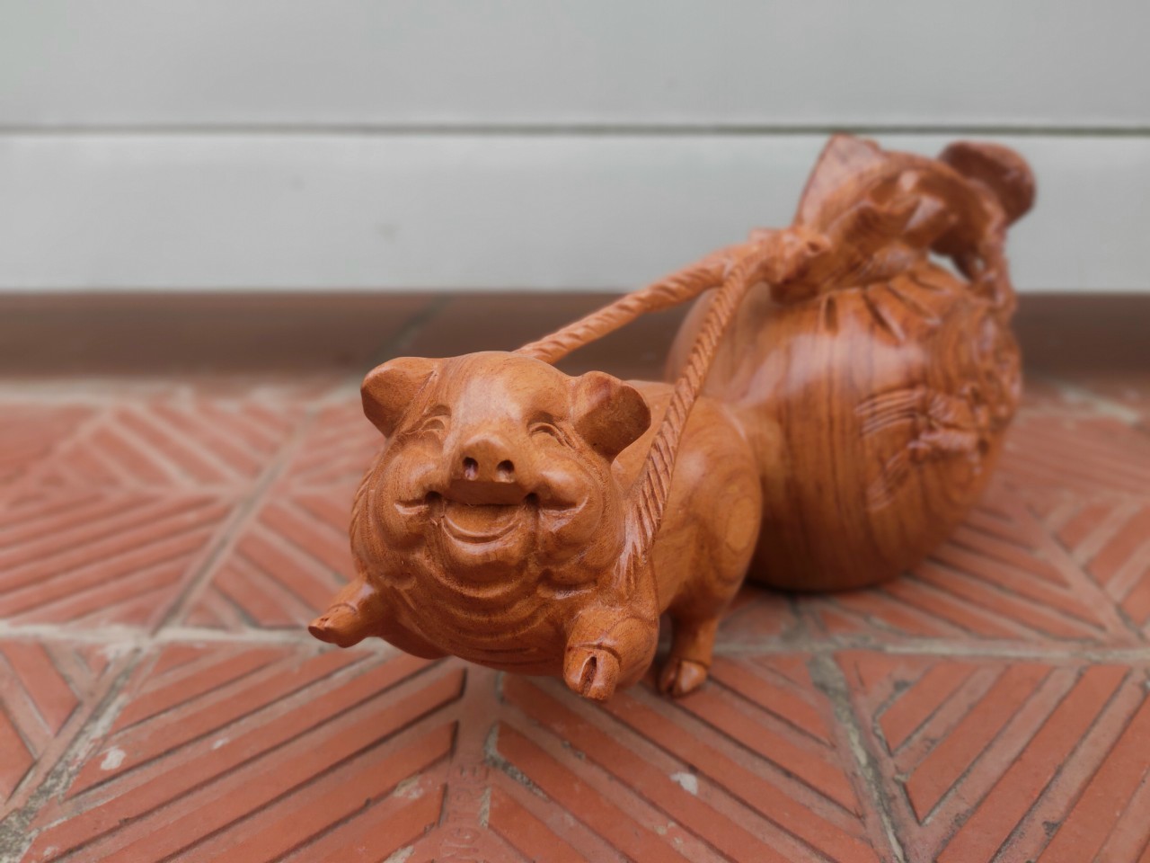 Mua tại Tiktok_ Tượng con heo kéo bao tiền được làm bằng chất liệu gỗ hương đá liền khối tự nhiên 100%