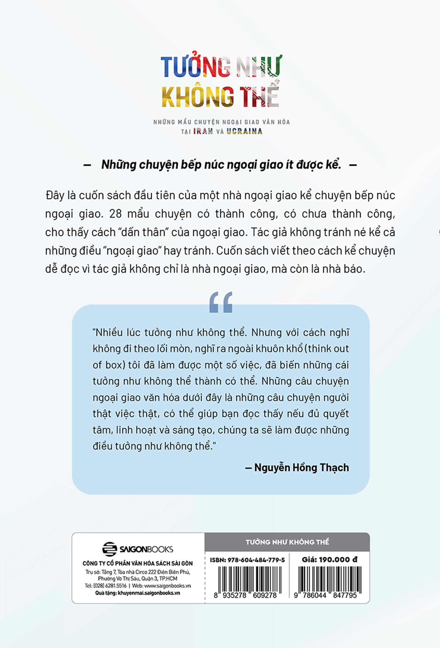 Cuốn sách “Tưởng như không thể” gồm 24 mẩu chuyện thú vị về cách đại sứ dùng thơ ca, điện ảnh, âm nhạc, ẩm thực… để “bắc cầu” mối quan hệ giữa Việt Nam và hai đất nước này.