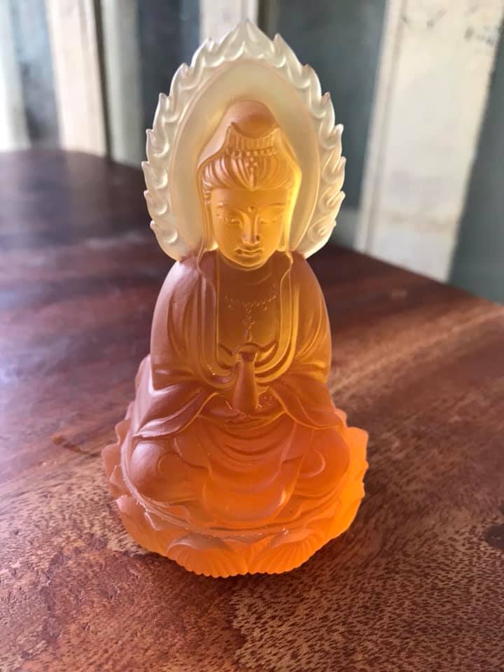 TƯỢNG PHẬT BÀ QUAN ÂM 2 MẶT ĐÁ LƯU LY VÀNG ĐẬM ĐỂ TRONG XE HƠI 10cmx6cm - HÀNG PHONG THUỶ SUNNY Q8