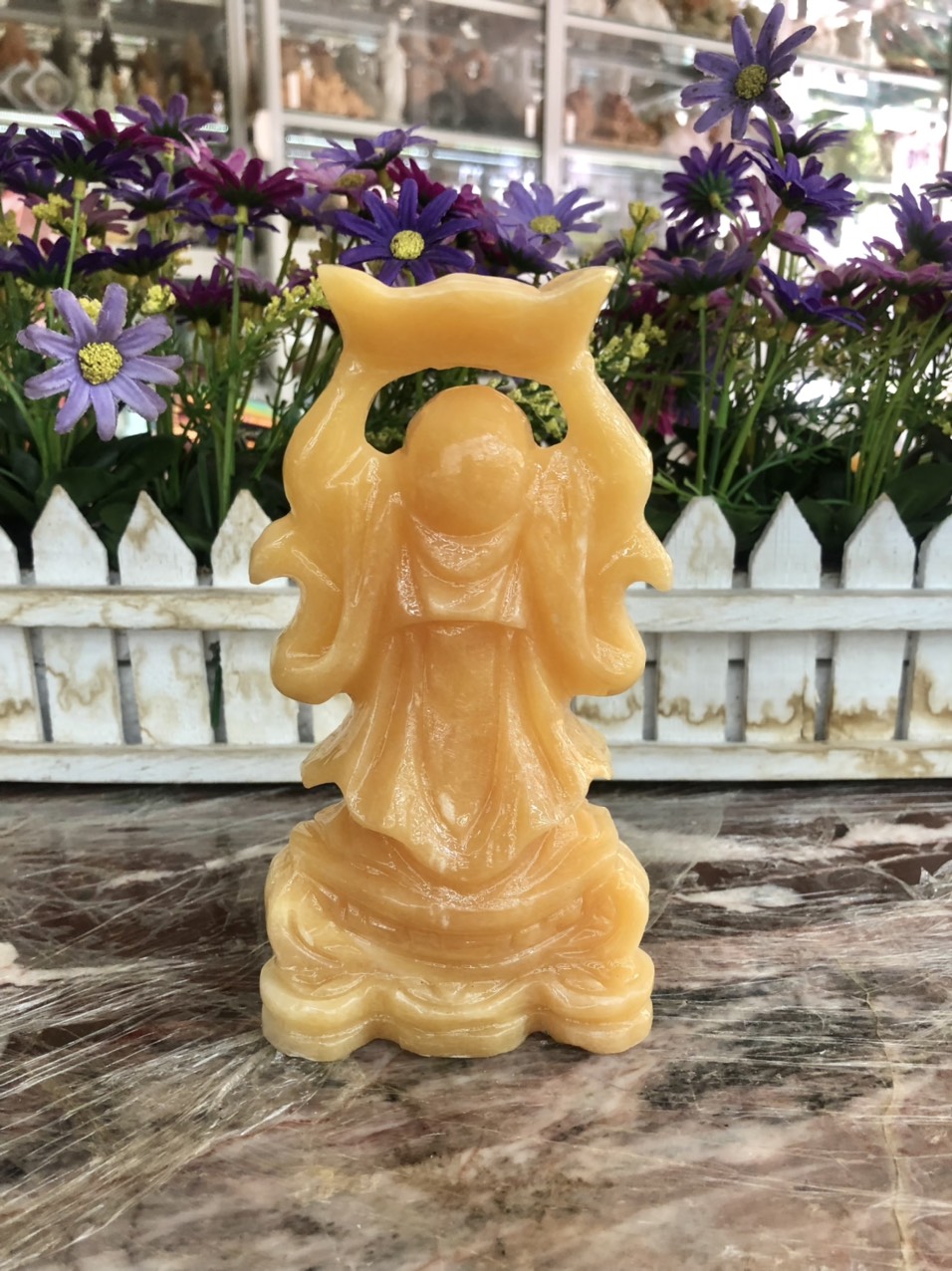 Tượng Phật Quan Âm Đá Lưu Ly Vàng Mới để trong xe hơi hoặc để bàn cao 12cm đk 7cm đế 5cm Mệnh Kim mệnh Thổ mệnh Thủy ạ *** Tượng Phật Quan Âm Đá