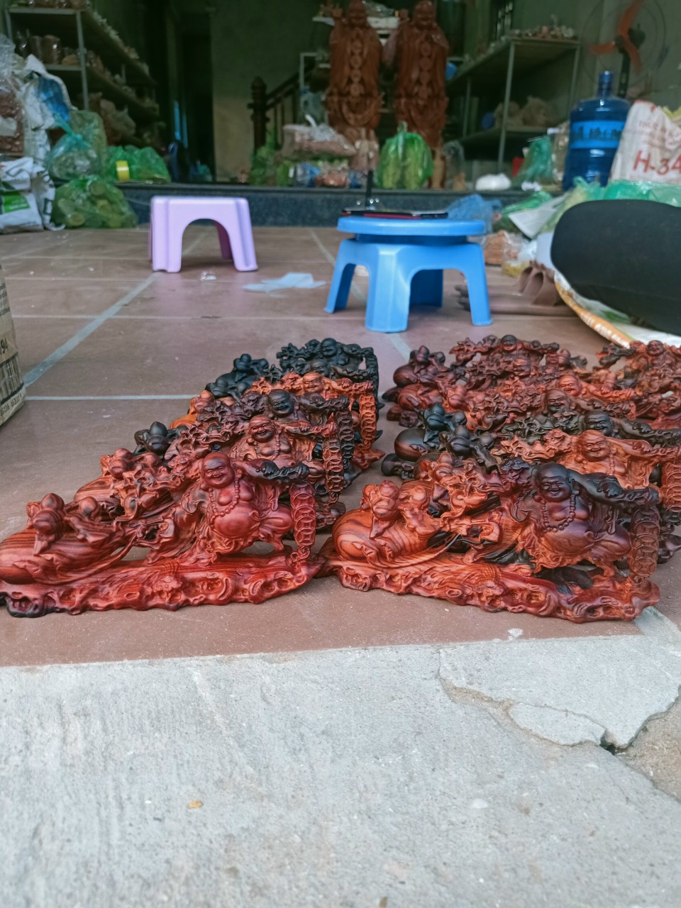 Tượng Phật Di Lặc tam Phúc gỗ Trắc đỏ đen mang tiền tài phong thủy tốt và niềm vui đến mọi nhà