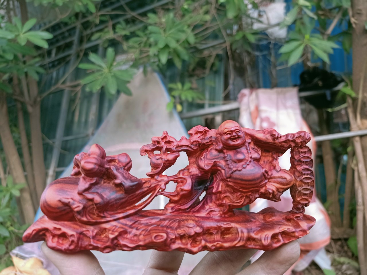 Tượng gỗ: Di lặc kéo bao tiền gỗ trắc đỏ đen | Tượng phật di lặc gỗ đẹp nhất | Xưởng Tượng Gỗ
