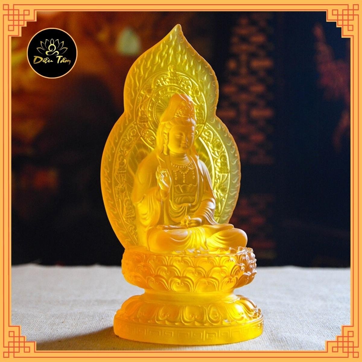 Tượng Phật Quan Âm Đá Lưu Ly Vàng Mới để trong xe hơi hoặc để bàn cao 12cm đk 7cm đế 5cm Mệnh Kim mệnh Thổ mệnh Thủy ạ *** Tượng Phật Quan Âm Đá