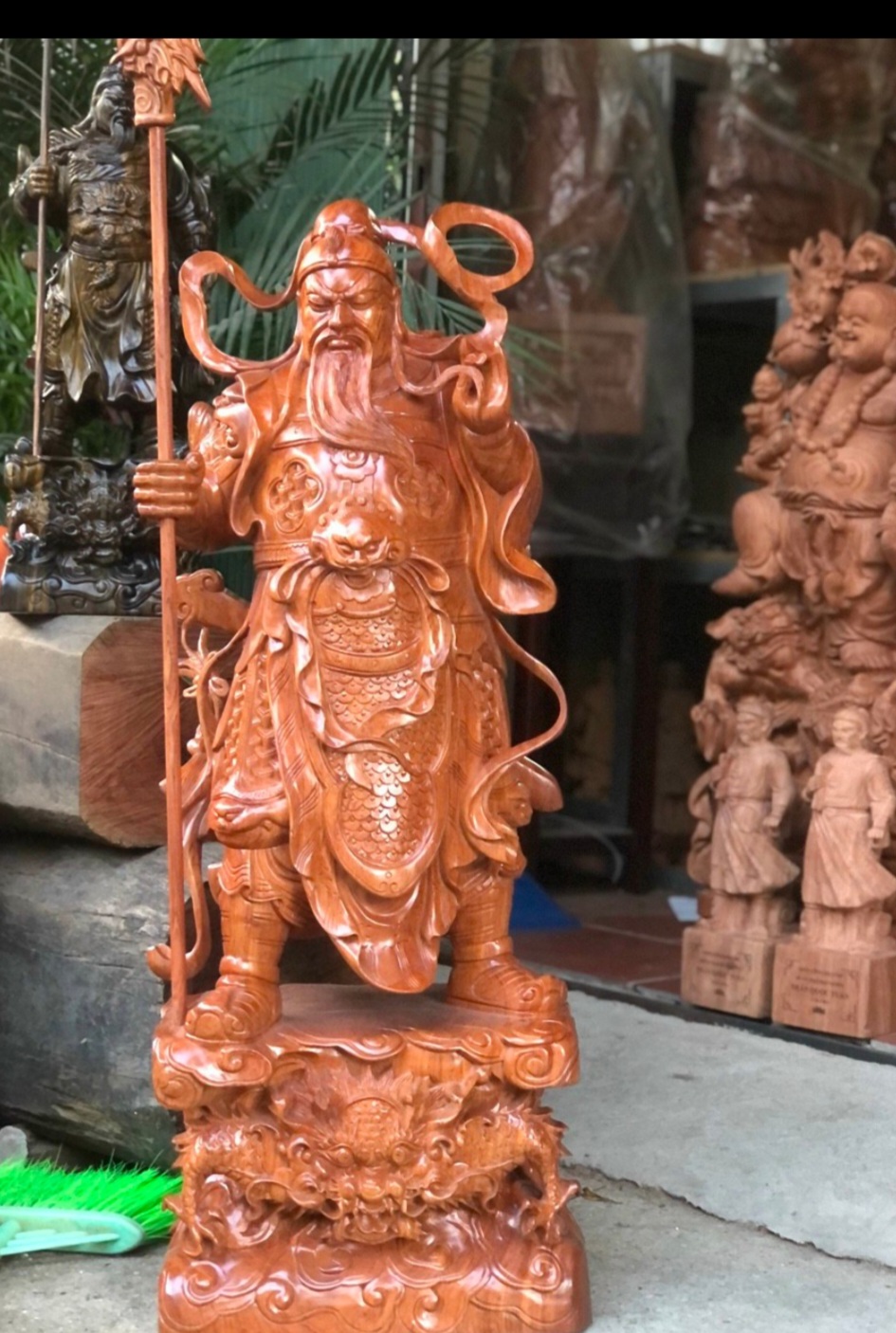 _ Tượng quan công cầm đao đứng trên đầu hổ phù được làm ,bằng chất liệu gỗ hương đá liền khối tự nhiên 100%