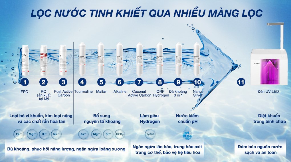 - Lõi chức năng: Lõi Tourmaline, Maifan, Alkaline, Coconut Active Carbon, ORP Hydrogen, Đá khoáng 3in1, Nano Silver tạo ion âm, cung cấp thêm khoáng chất, bổ sung kiềm làm tăng độ PH, bổ sung Hydrogen, chống oxy hóa và tăng cường miễn dịch cho cơ thể.
