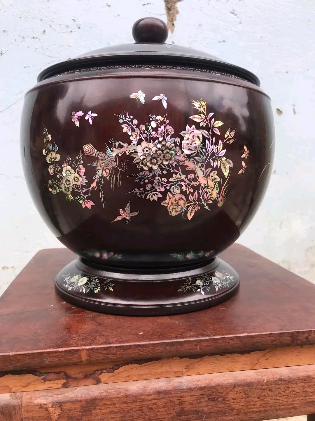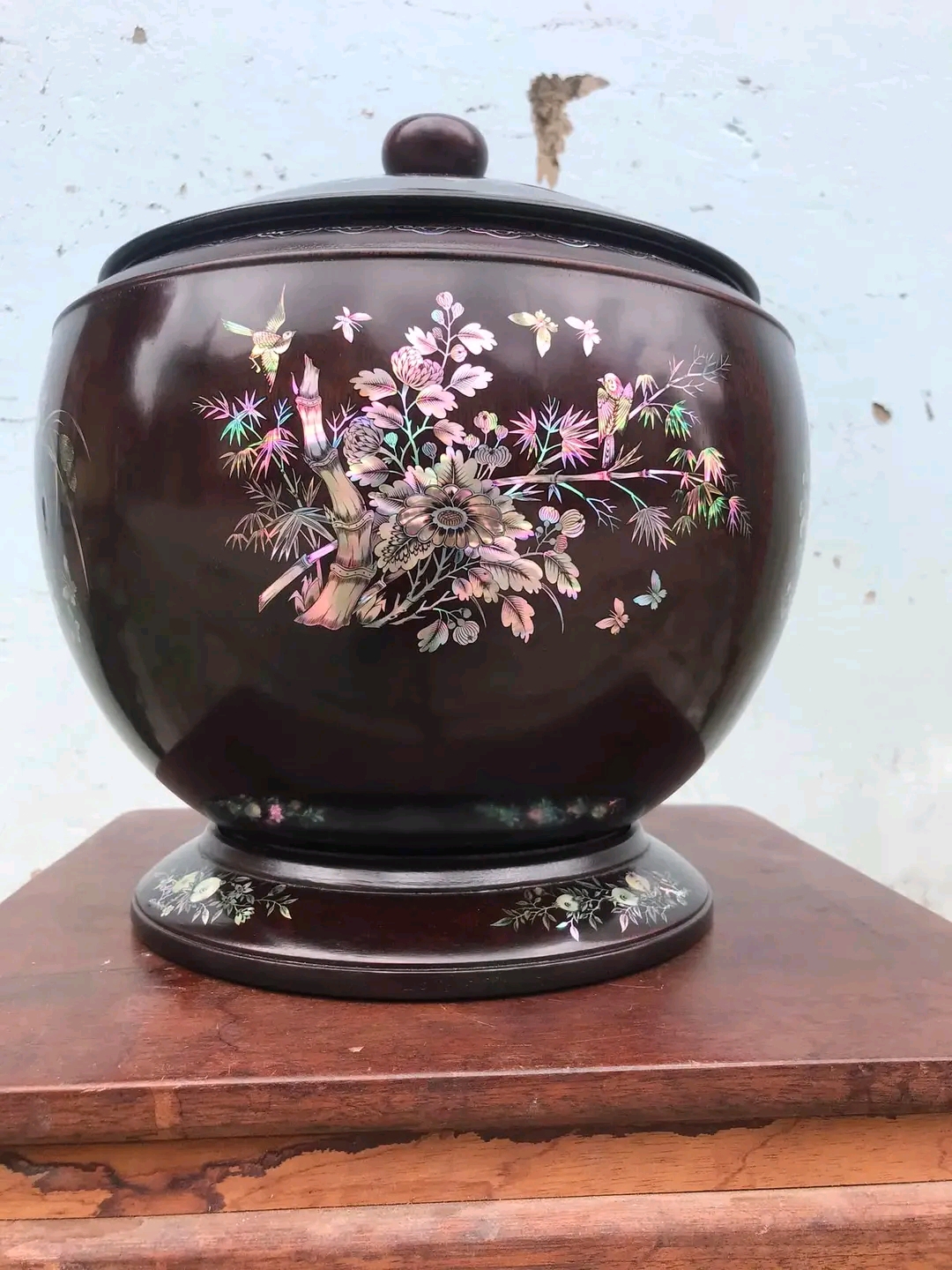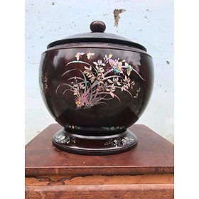 _ giỏ ủ bình trà được làm bằng chất liệu gỗ gụ ,kết hợp với khảm ốc đỏ và vỏ bào ngư xanh đỏ tự nhiên 100% _ Kt cao 31 thân tròn rộng 32cm