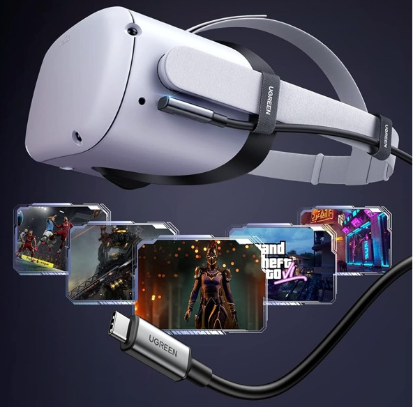 Cáp liên kết VR Ugreen 90629 USB C tương thích hoàn hảo với Oculus/Meta Quest 2/1, kết nối tai nghe VR với PC chơi game của bạn, cho phép bạn truy cập vào nhiều lựa chọn trò chơi Oculus Rift và ngày càng phát triển. Trò chơi Steam VR, mang đến cho bạn trải nghiệm chơi game VR thú vị.