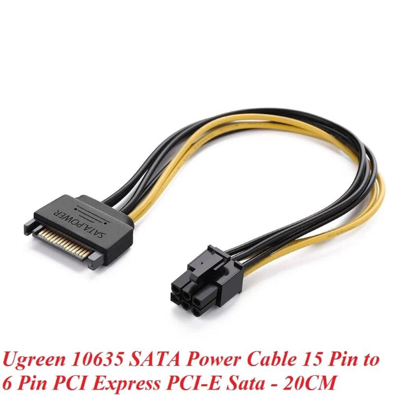 1. Hãng : Ugreen 2. Mã sản phẩm : 10635 3. Màu : Đen Vàng 4. Chiều dài cáp : 20CM 5. Đầu vào : 15-Pin SATA Male 6. Đầu ra : 6-Pin PCI-Express Card
