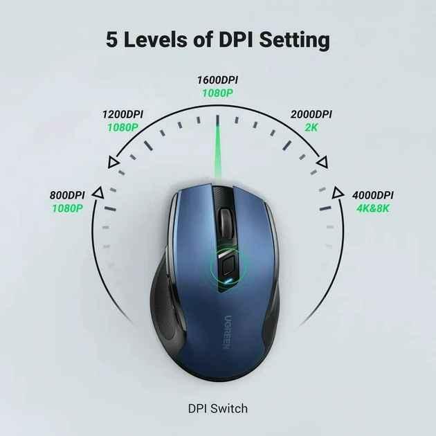 1. Brand: UGreen 2. Product name: Wireless mouse 3. Model: MU105 4. Color : Midnight Blue 5. Connection method: 2.4G wireless (USB receiver) 6. Working distance: 10 meters 7. Sensitivity: 800/1200/1600/2400 (four gears) 8. Return
