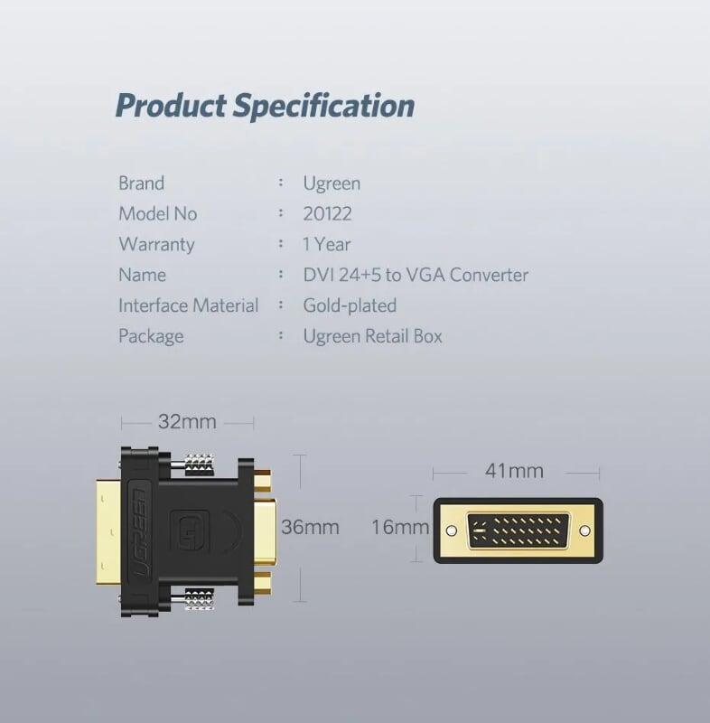 Ugreen 20122 DVI 24+5 To VGA Female Adapter Gold Connector Converter 1. HDMI adapter dvi vga adapter connector converter - DVI (24 + 5) to VGA female adapter 2. Color: Black 3. 100 g 4.