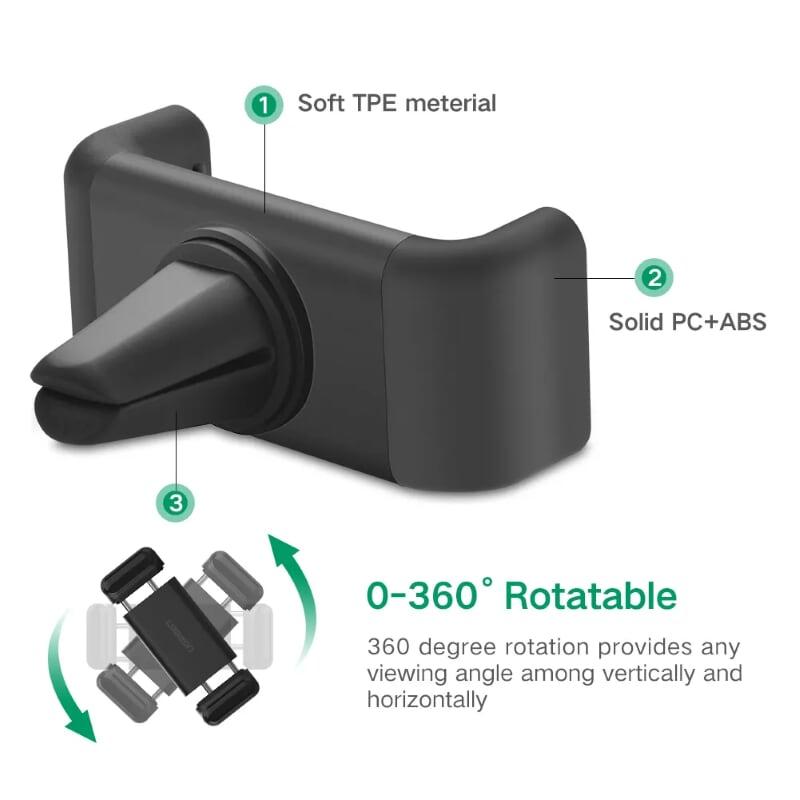 Ugreen 30798 360 Air Vent Mount Phone Holder Kẹp Điện Thoại Trên Xe Hơi Lp120 1. Product name: Phone clip 2. Material: PVC, ABS, silica gel 3. Color: Black 4. Application size: Use for Smartphone;