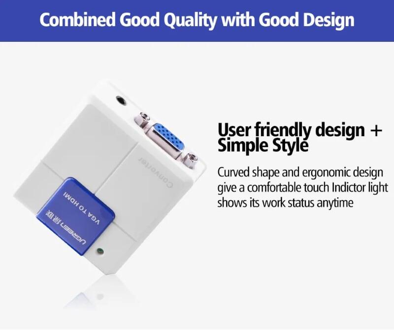 - Bộ Chuyển Đổi Ugreen HDMI Sang VGA Audio Cáp Tròn Có Nguồn Phụ 40253 giúp kết nối máy tính xách tay, Macbook, Chromebook, Rasberry Pi với giao diện HDMI để chiếu, hiển thị, màn hình