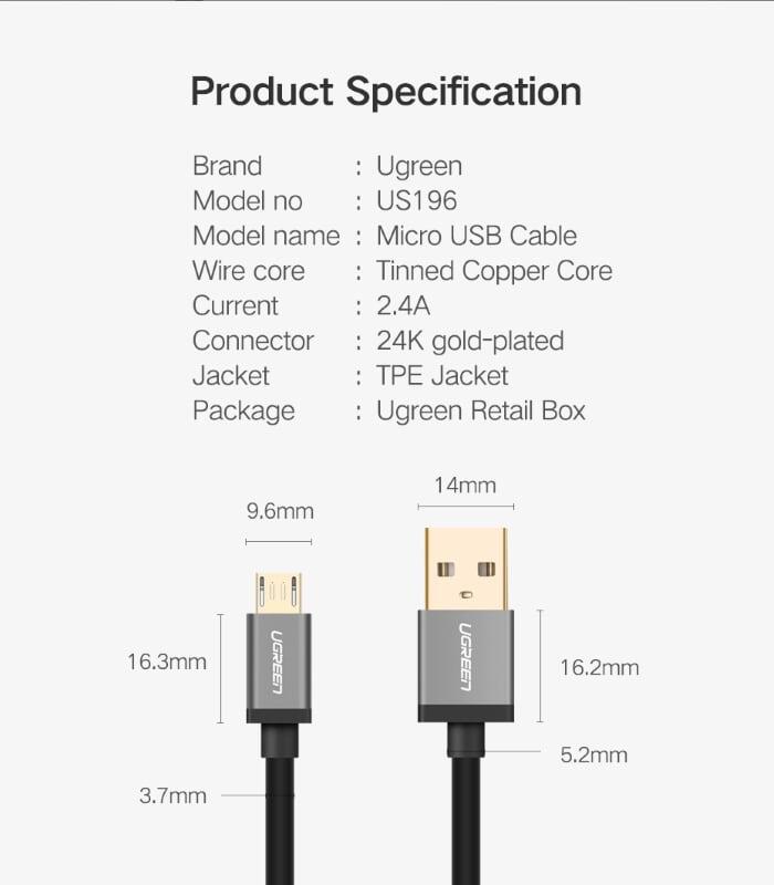 Ugreen 60146 1m micro usb 2.0 data cable aluminum case us290 1. Length : 1M 2. Color : Black 3. USB Version : 2.0 4. Charger + Data Transfer Link Cable USB 2.0 5. 100