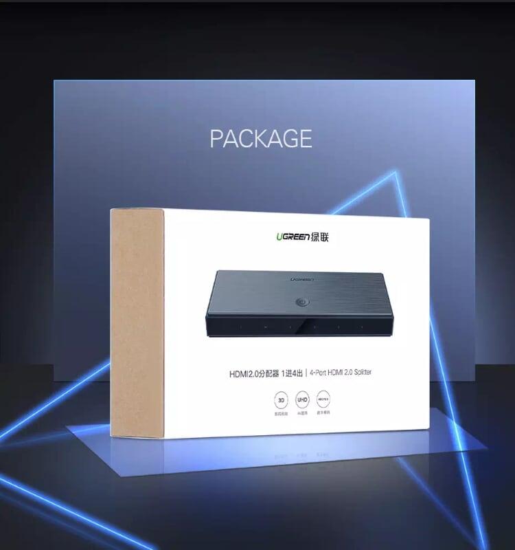 Ugreen 50708 1X4 Hdmi 2.0 Splitter Support 4K*2K@60Hz 1080P Cm187 1. Input: HDMI 2.0 x 1 2. Output: HDMI 2.0 x 4 3. Support HDR, HDCP 2.2 4. Support resolution: 4K * 2K @ 60Hz