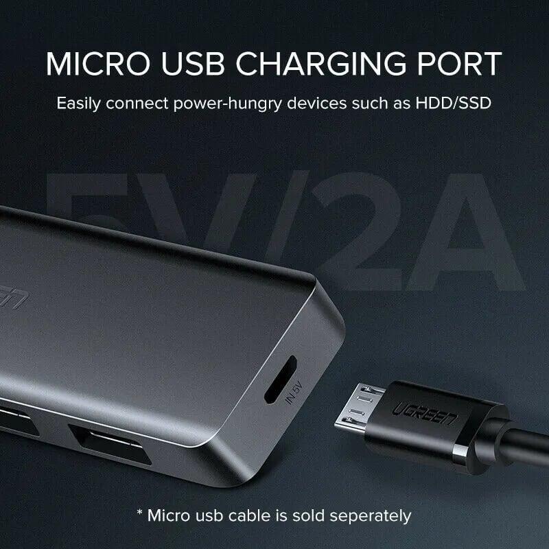 Ugreen 20277 1m 4 ports usb 2.0 hub with micro usb power port màu đen cr106 1. Input : USB-A 2. Output : 4 Port USB 2.0 . 3. Color : Black 4. Length :